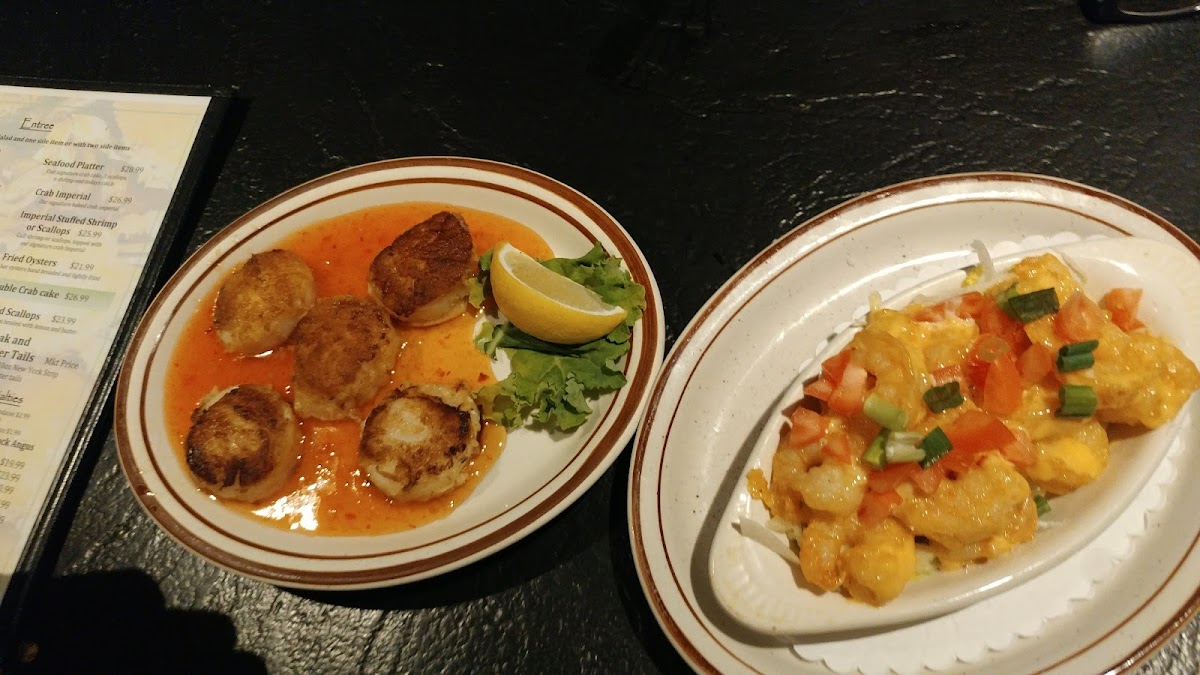 Gulf shrimp or scallops, topped with crab imperial