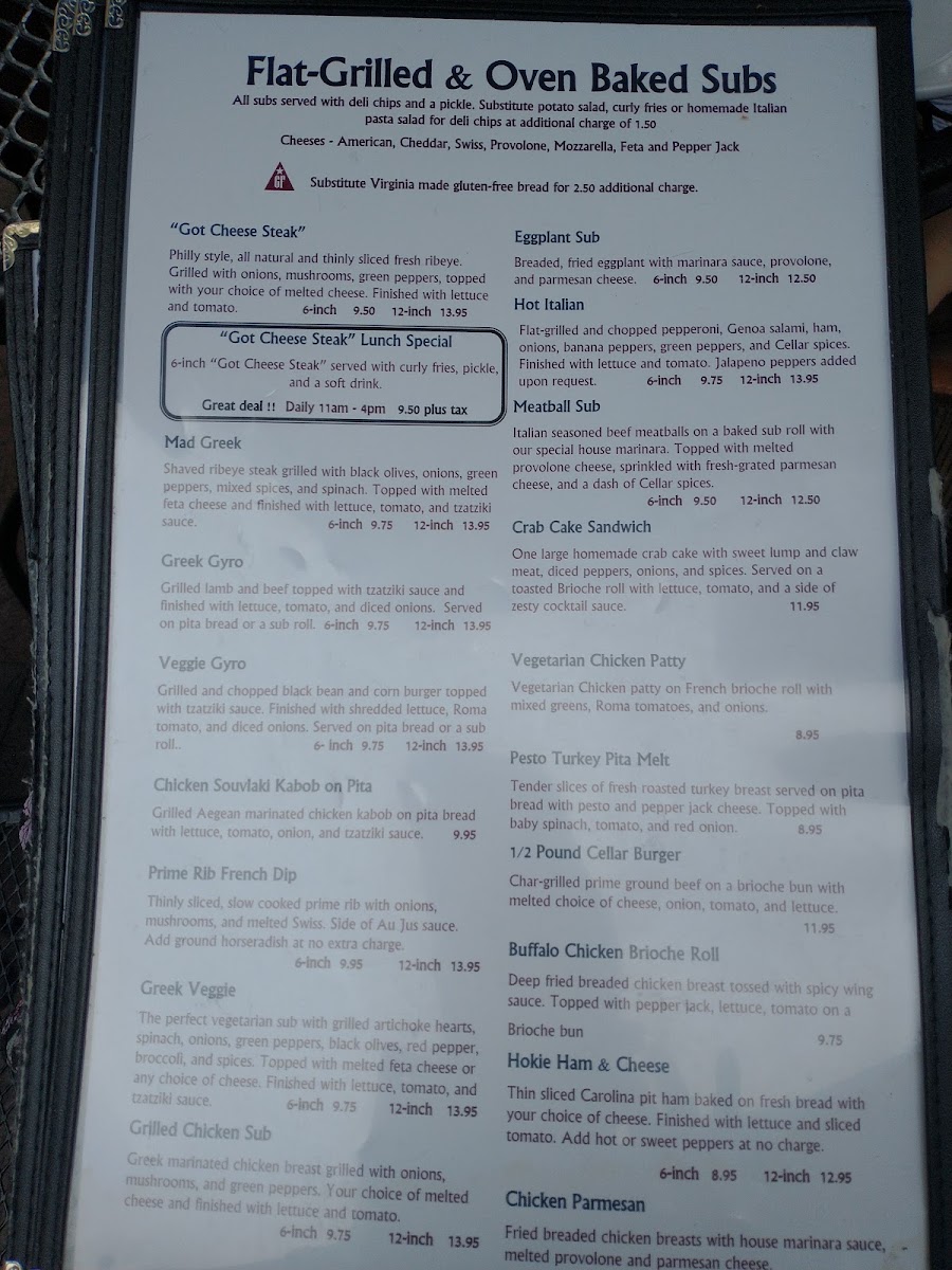 Italian seasoned beef meatballs on a baked sub roll with our special house marinara. Topped with melted provolone cheese, sprinkled with fresh-grated parmesan cheese, and a dash of Cellar spices.