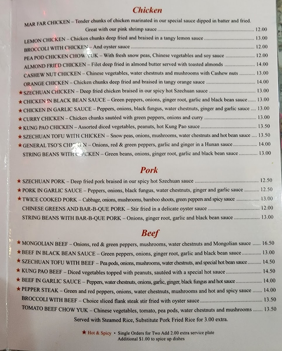 Kung Pao Chicken, Pork Fried Rice, Mar Far Chicken