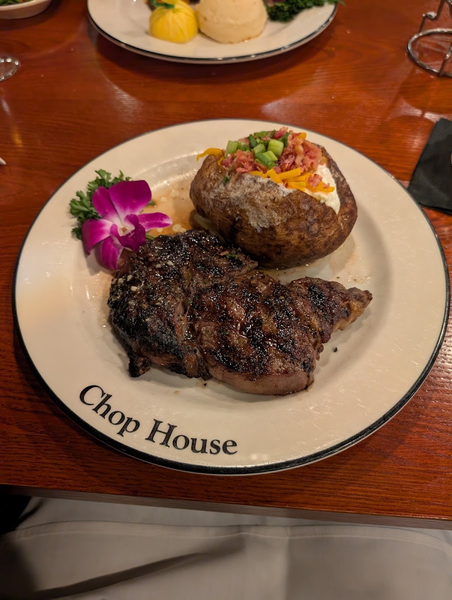 This was my third time eating at Capital City Chophouse. This time was for a retirement party for a colleague. The room was decorated really nicely, the service was really good, and the food was very delicious. We ordered the following appetizers: fruit and cheese tray, bruschetta, calamari, and crab dip. All our guests raved over how good the appetizers were. For my entree I ordered the Lamb chops with a loaded baked potato and a chopped salad. The chopped salad was very good and the lamb chops and baked potato were very tasty! For dessert I ordered the Mile High chocolate cake which comes with cappuccino ice cream. Let me just say, you will not be disappointed! The dessert serves 2+ people and it is huge! I highly recommend eating at the Chop house if you haven't before. The service is very good and the food is delicious. Yes, the prices and are a little high, but the portion sizes are so worth it!