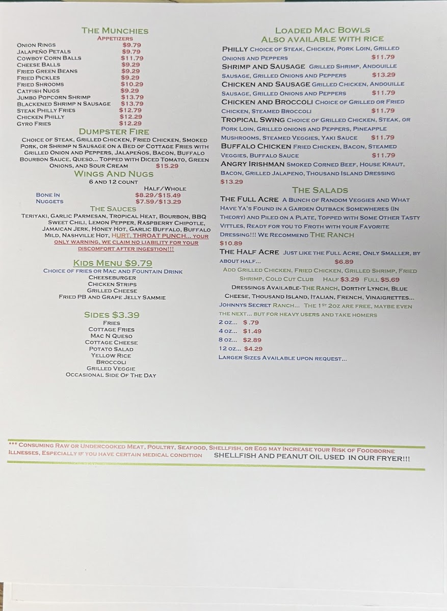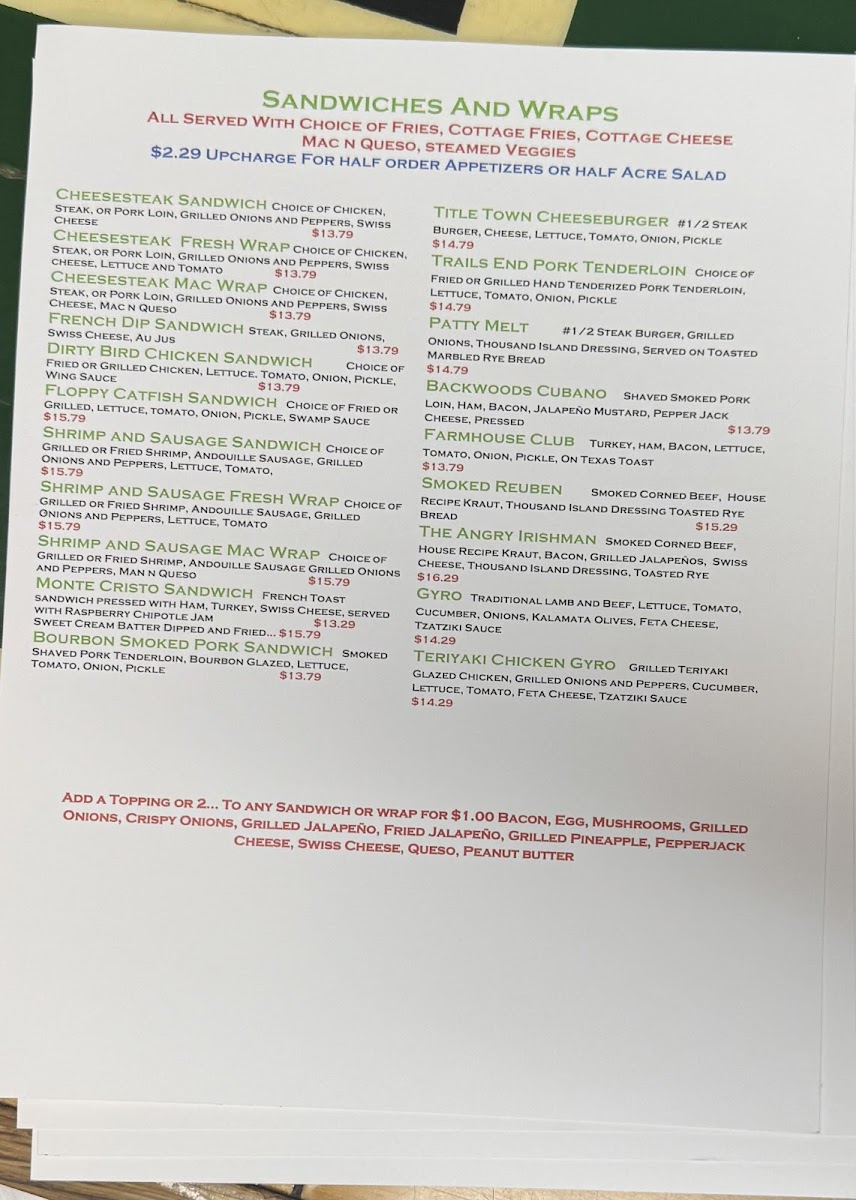 CHOICE OF CHICKEN, STEAK, OR PORK LOIN, GRILLED ONIONS AND PEPPERS, SWISS CHEESE, MAC N QUESO. ALL SERVED WITH CHOICE OF FRIES, COTTAGE FRIES, COTTAGE CHEESE, MAC N QUESO, STEAMED VEGGIES.