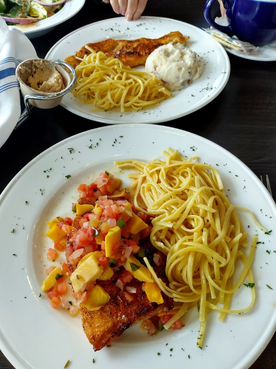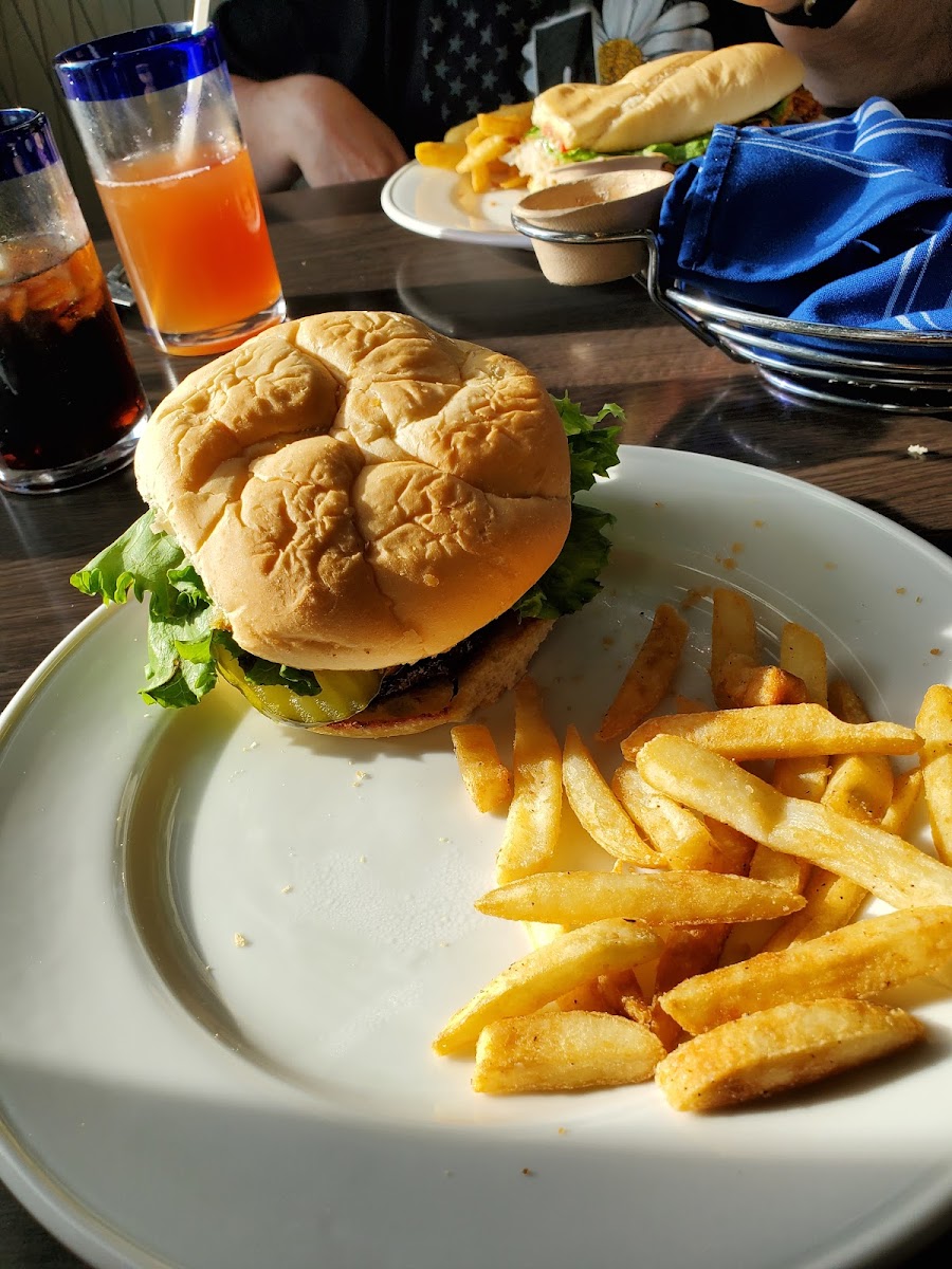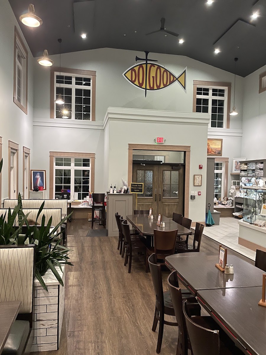 This place is so welcoming and the service can't be beat. I got the Jonah fish sandwich. The white fish was super crispy and delicious, and it's a large piece of fish, couldn't have been better. The fries and slaw were good too. Prices are very reasonable here as well. The ambiance and space are beautiful, bright and clean. All tips go to help a special family picked each month. I really enjoyed my time here and will be back to try more of their dishes! They also serve decaf and regular coffee, coffee drinks and lattes, and big smoothies. Update: Visited again for dinner and got the fried fish entree. Two large pieces of crispy delicious white fish, with coleslaw and fries. I got a cup of tomato soup as well. I thoroughly enjoyed the meal and they were able to set me up at a corner table in the back so I could get some work done on my computer. I also opted for their cinnamon roll cheesecake dessert and it was one of the better desserts I've had at restaurants. My waiter was very attentive and checked in on me often to see how I was doing and ask if I needed anything. This place is always very affordable as well. With this large entree with plenty of fish, several sides, and dessert my total only came to $17. This is my favorite place to get dinner in the area. Update: Visited again while in town and got my favorite, fried fish. It was large, crispy and delicious as always. Also tried their poblano cheese soup, which was delicious. Service is always friendly and they do their best to please. Always very affordable too.
