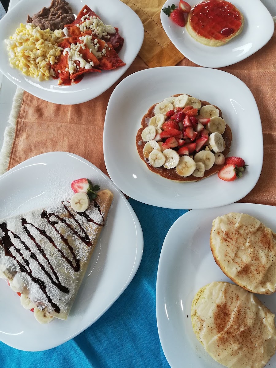Cuenta con variedad de platillos dulces y salados hotcakes ,pan frances, wafles, crepas, molletes; esto por los antojos matutinos o vespertinos; además cuentan con desayunos completos Huevos, chilaquiles; tiene buen servicio, no hay mucho dnd estacionarse, $, muy limpio el lugar