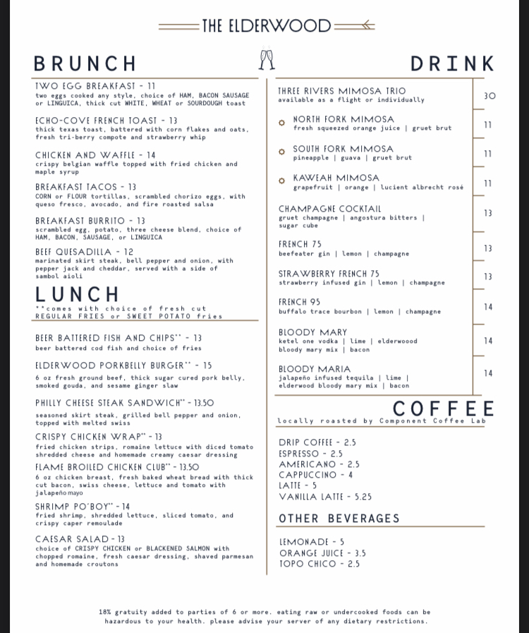 Check out our brunch menu at https://www.elderwoodvisalia.com/menus/ for more brunch menu selections!