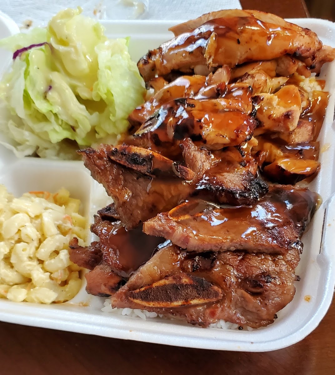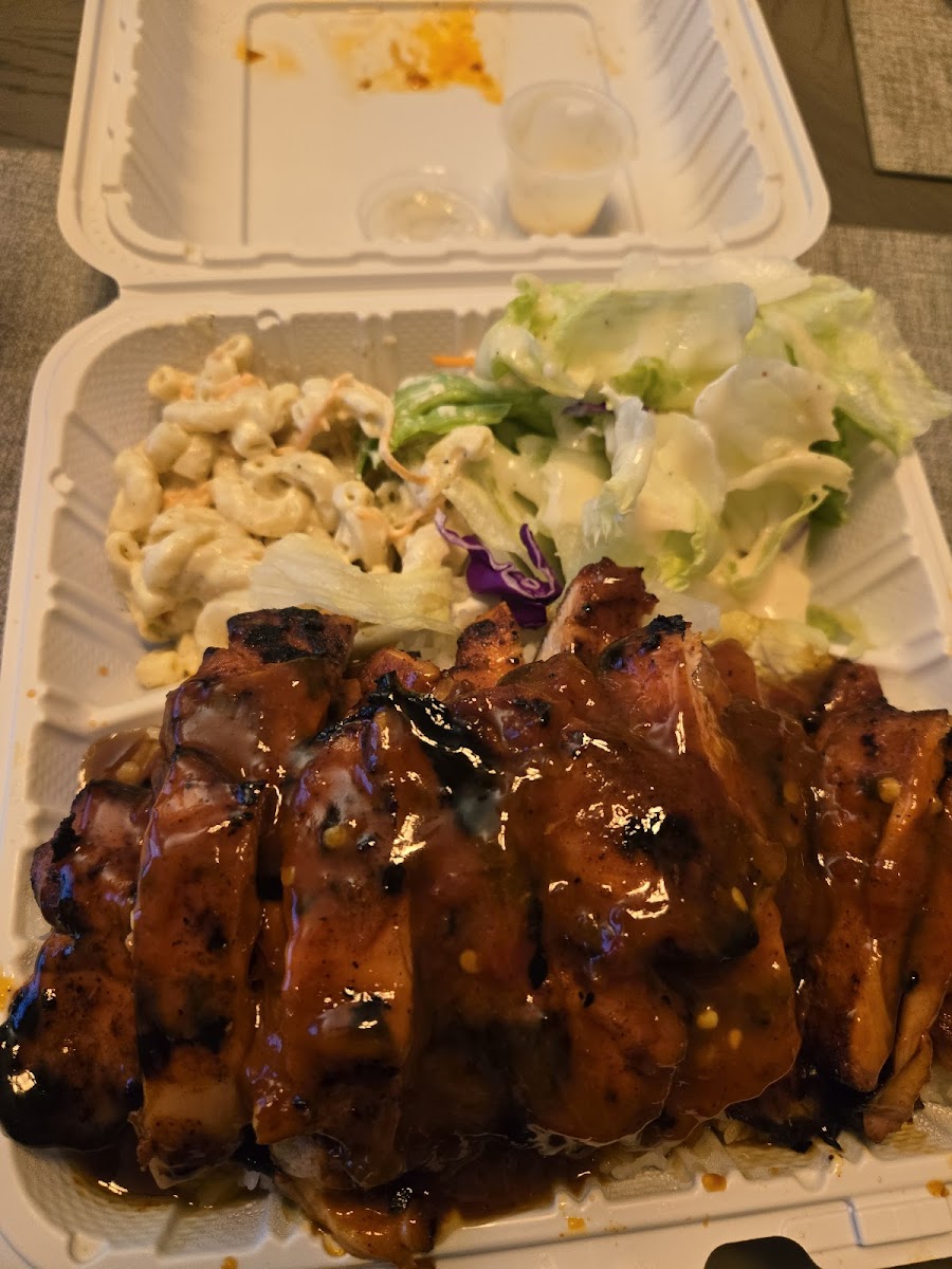 Our family mainly order takeout. The fave is spicy teriyaki chicken and the combo with teriyaki chicken & short ribs. I can just eat the short ribs alone. So good! The box is so heavy that you will want to hold it with two hands. One order is enough for two people since they give you so much.