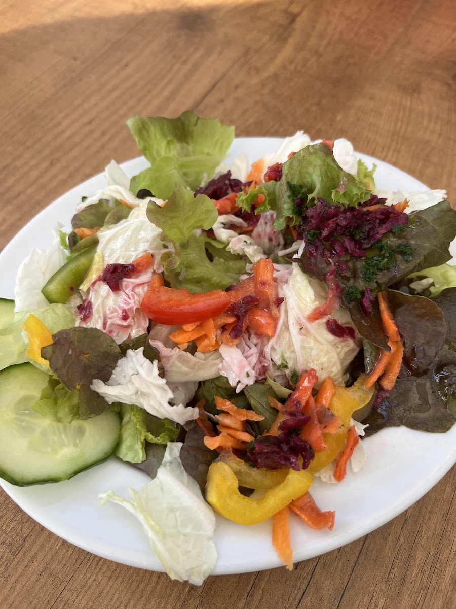 In Bayern eine vegane Bratwurst, mit Salat und Super Dressing sowie hervorragende Pommes. Wer hätte das erwartet, im bayrischem Mutterland des Fleisches ! Einfach genial und mit Herz serviert !