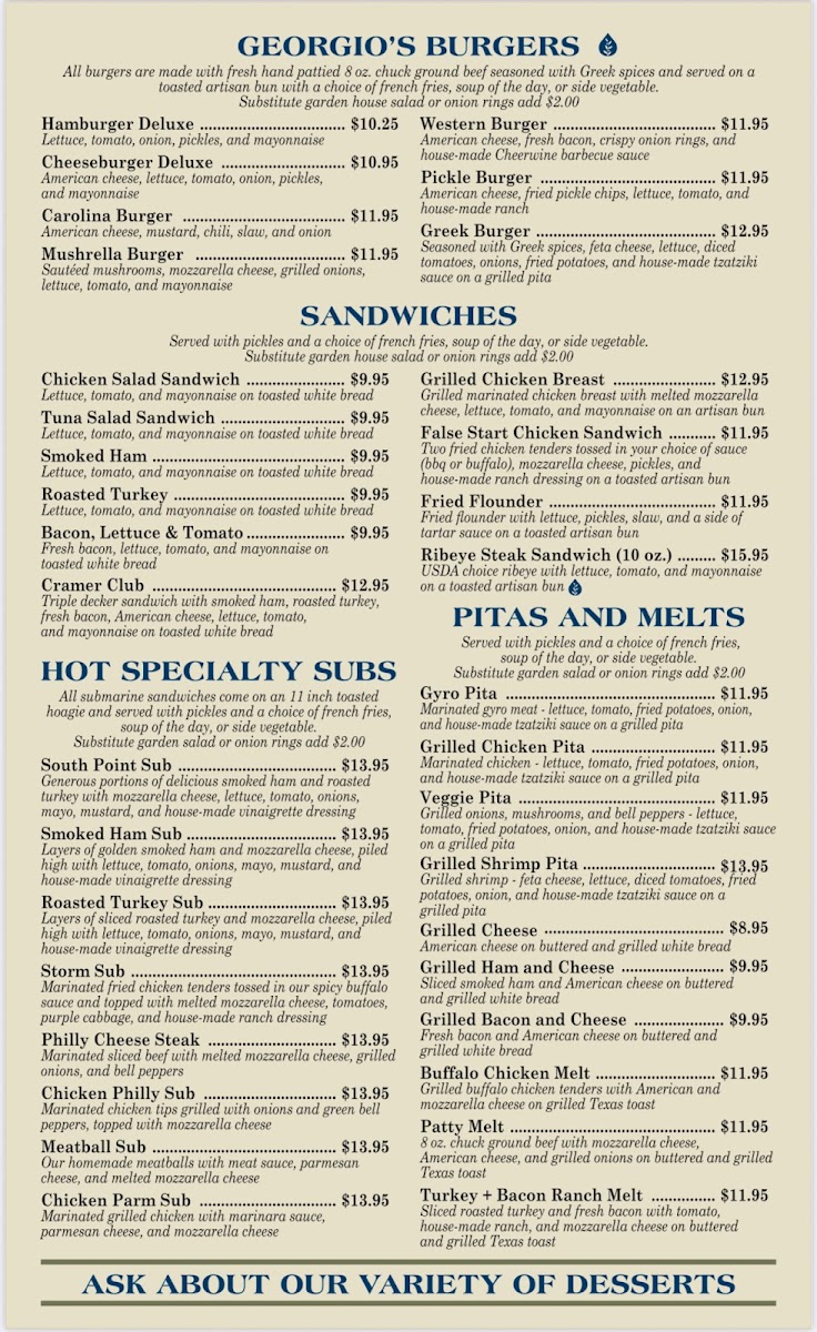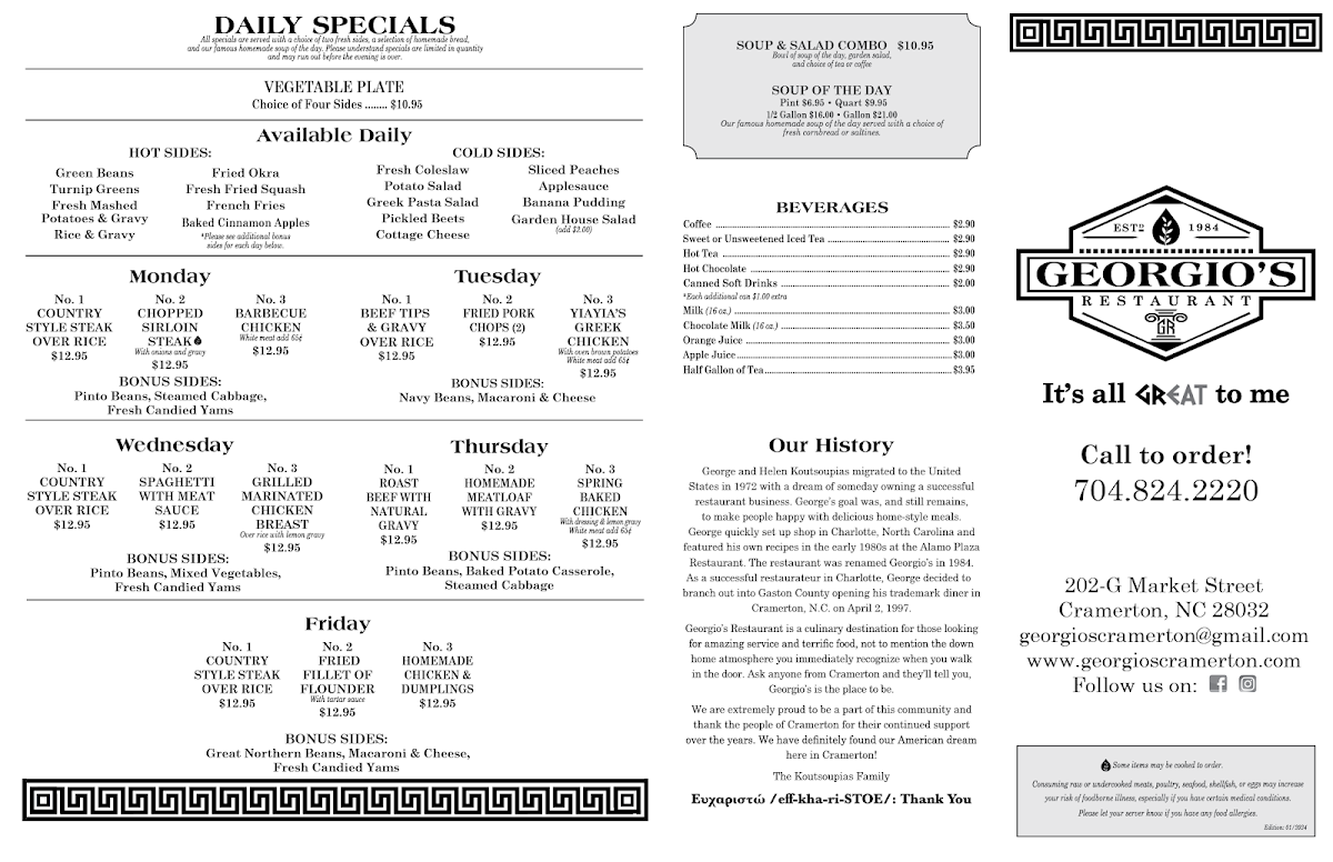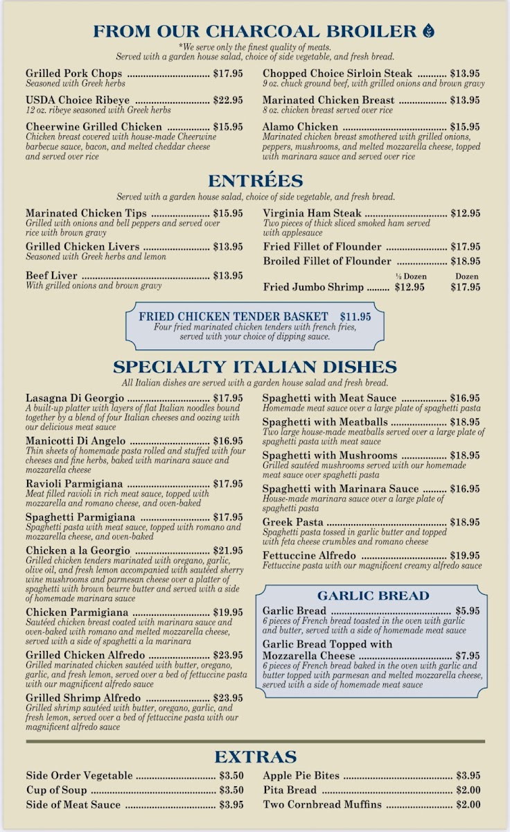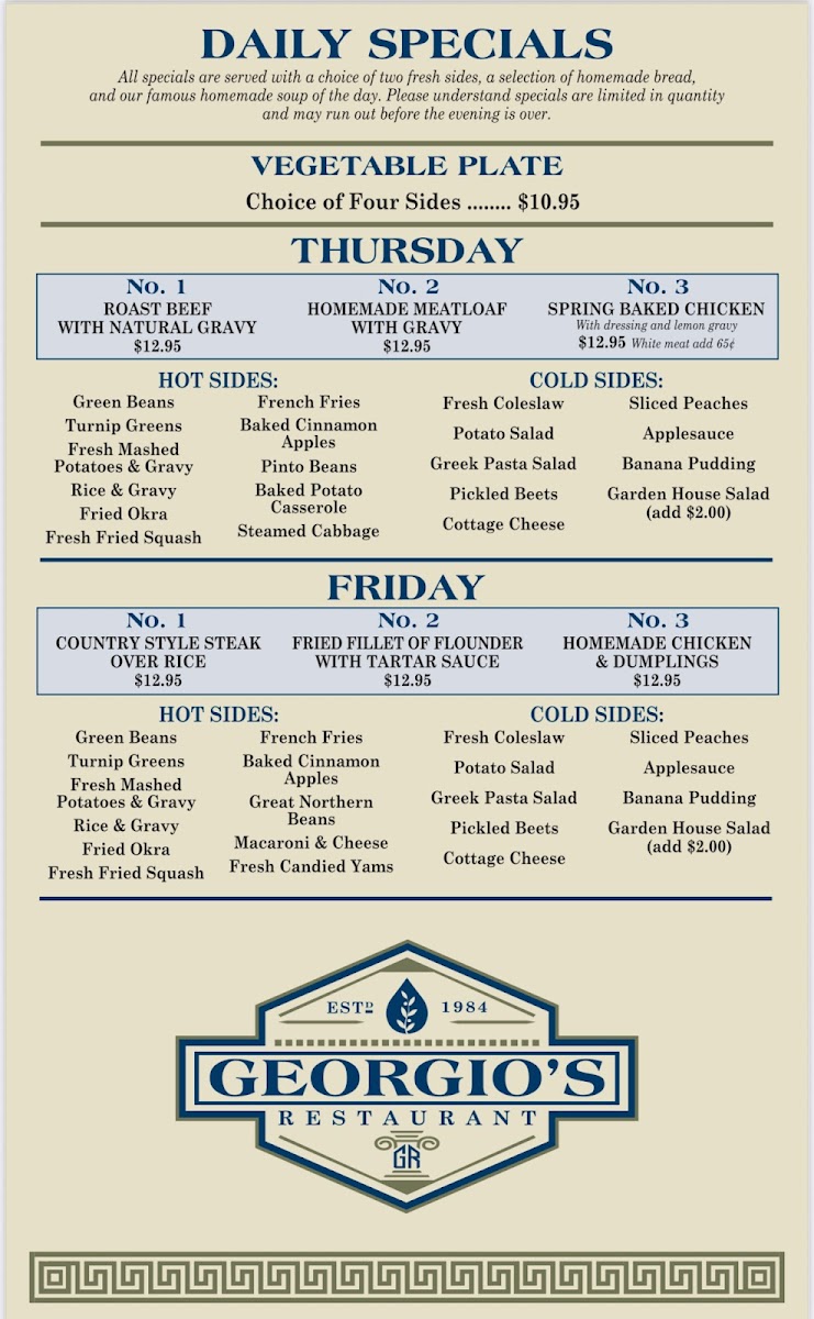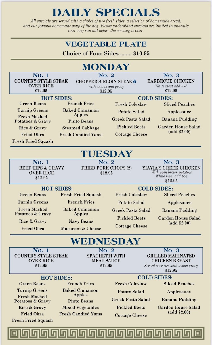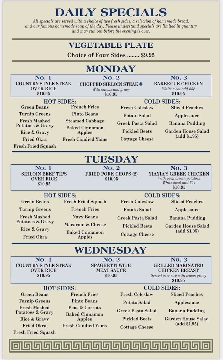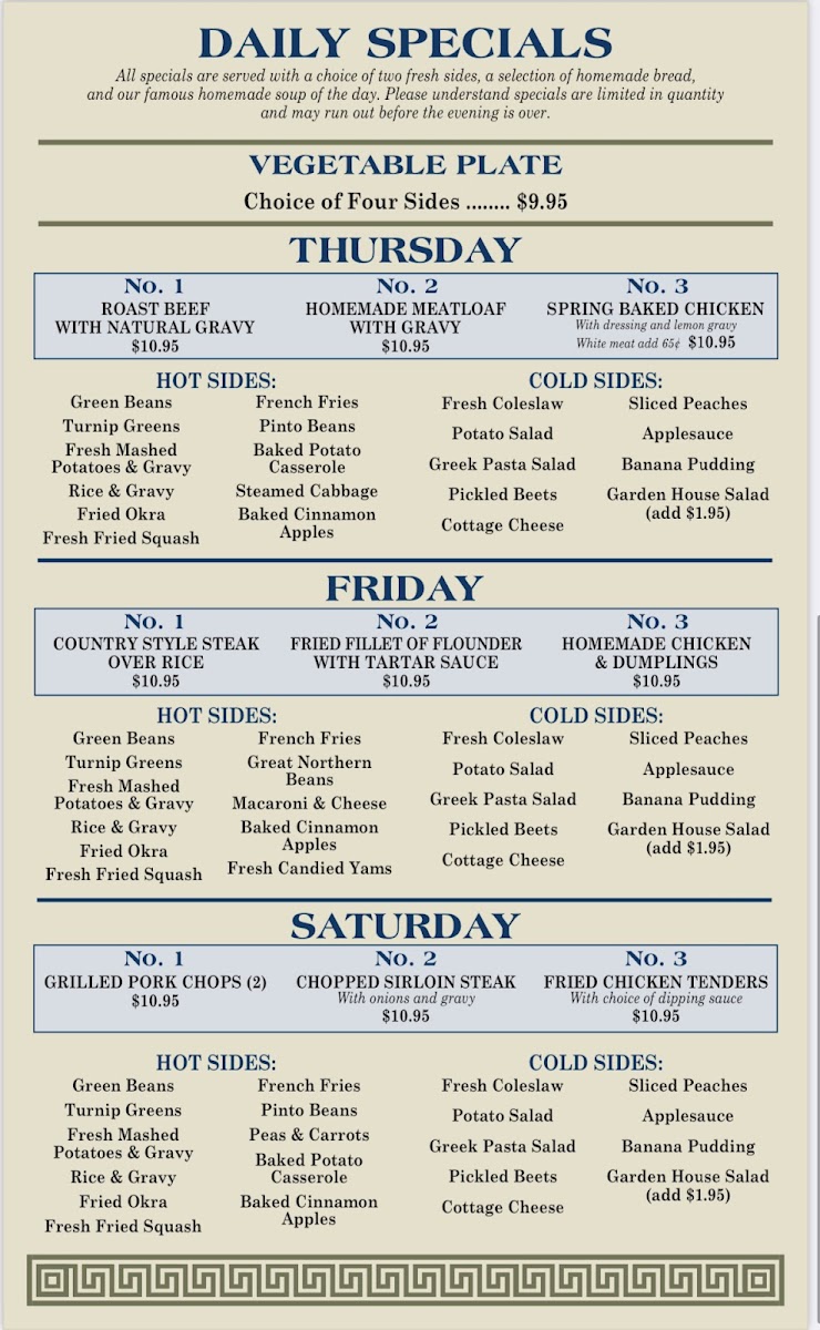A bowl of our famous homemade soup of the day served with a choice of fresh cornbread or saltines. Dine-in: includes one free refill.