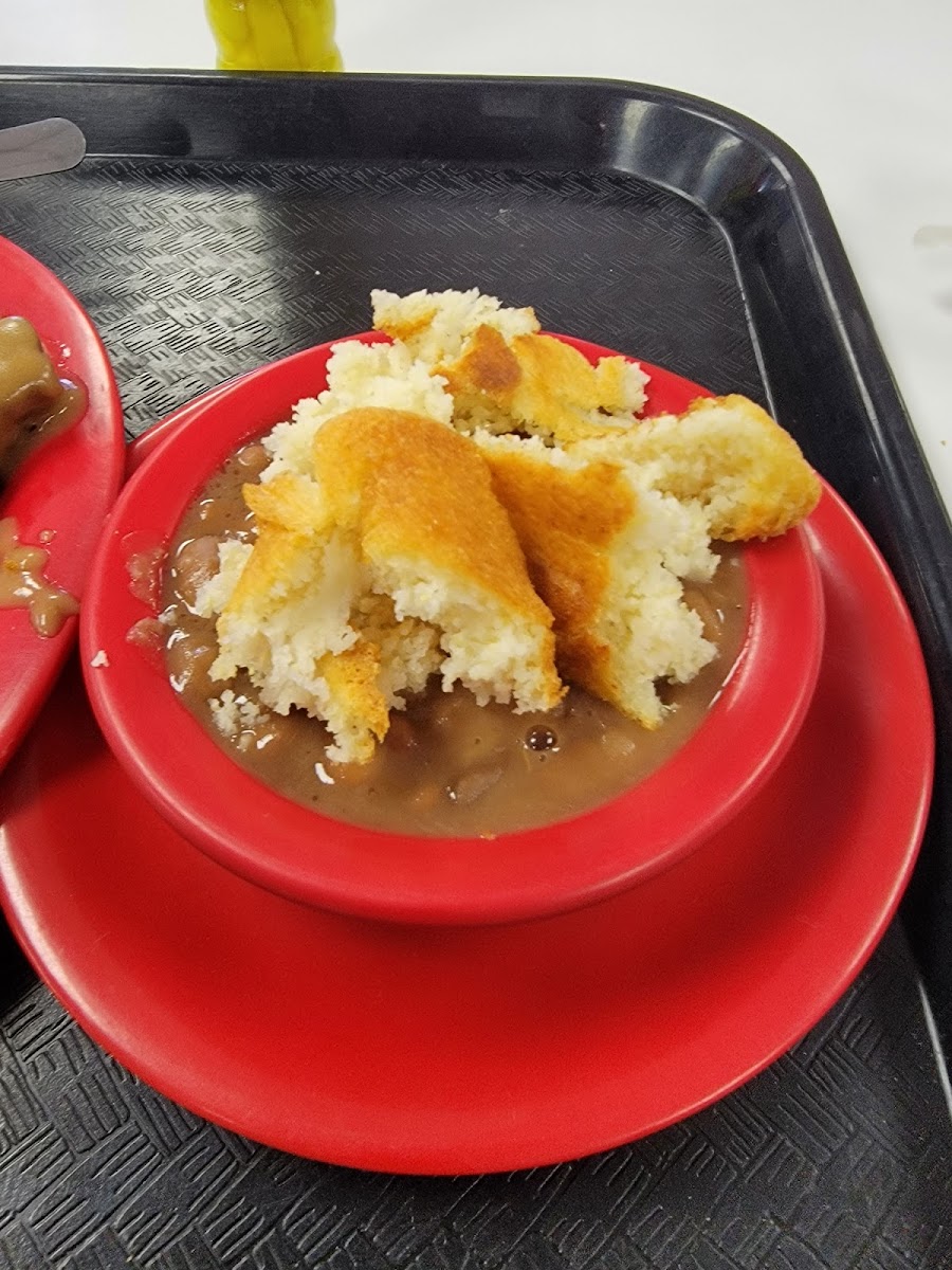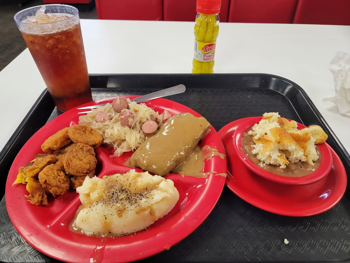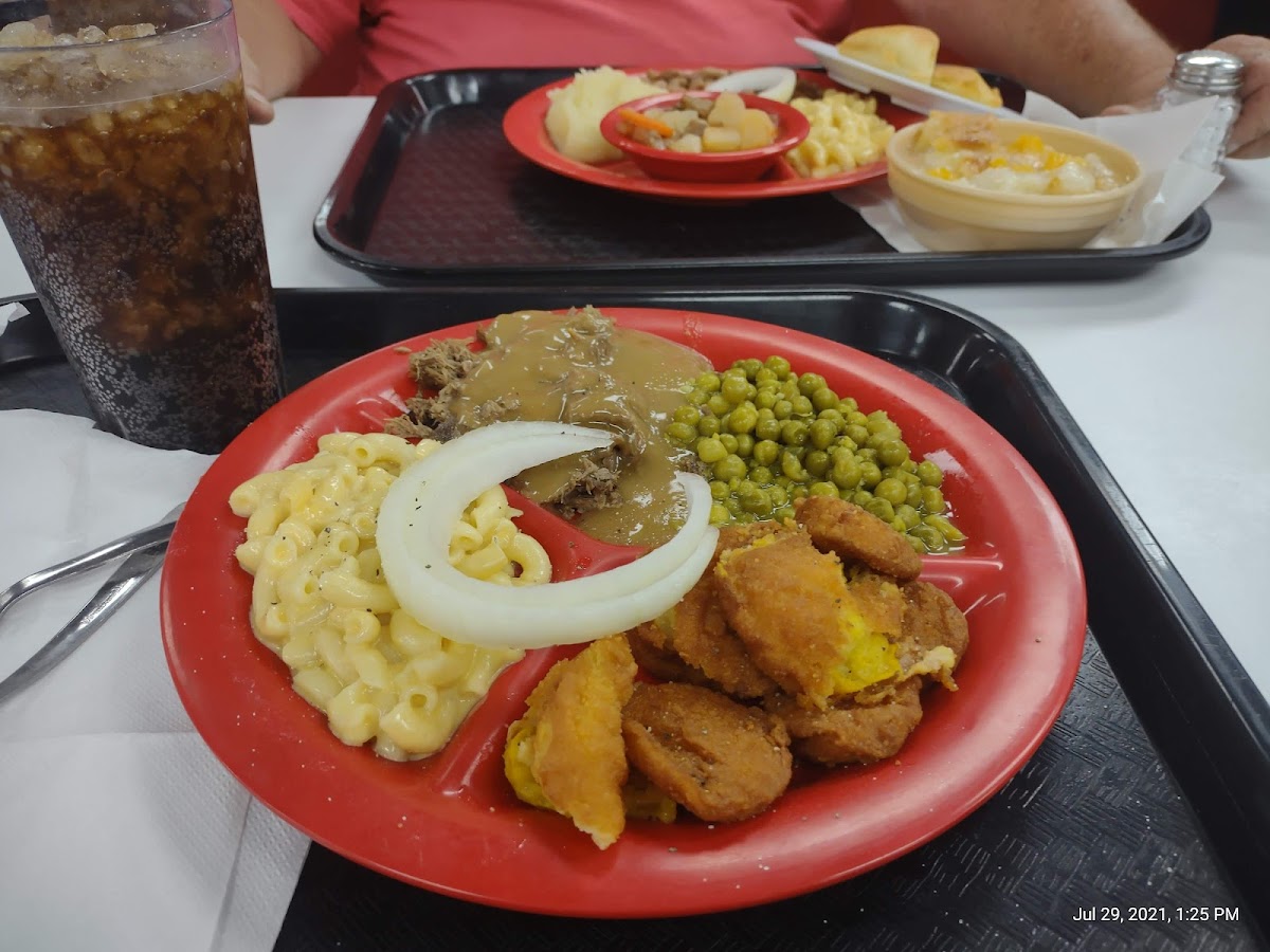 TRUCK Parking in back. Take the side street past the store. Wife and I had the Fried Chicken. We got here at 2pm on a Monday 30 min before they closed-- they didn't make is feel rushed. We both had Fried chicken breasts Fried ocra, deviled eggs, Cole slaw, potato salad, corn bread, iced tea, peach cobbler, mashed potatoes gravy. Could barely walk out.... total was 16.73. Cafeteria style. Love it.