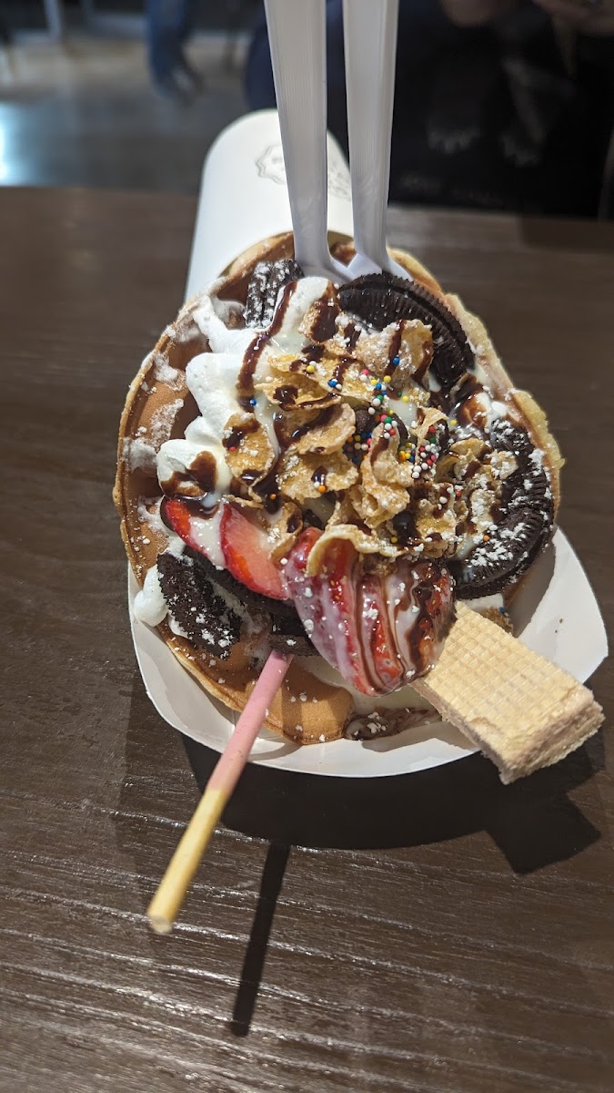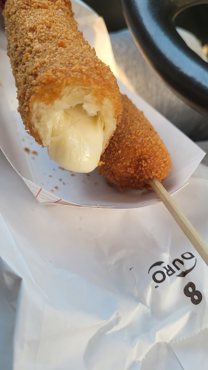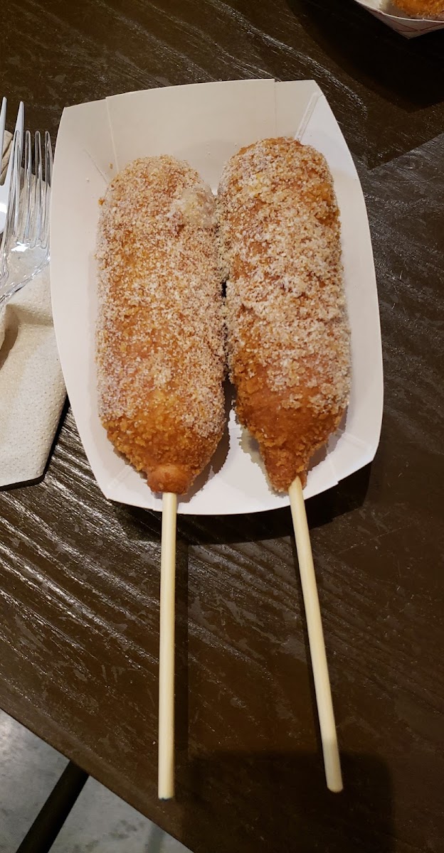Absolutely love this place! Will forever live in my head rent free Their Korean corn dogs are all beef and I love the different textures- potatoes on a corn dog are amazing! I also love the pure mozzarella cheese sticks- so good Plus their sauces really take it to the next level! I also enjoyed a waffle, an Oreo flavor. Also good and served with a color changing spoon! They also do have a varieties of individual portioned drinks and random merchandise like phone cases and keychains!