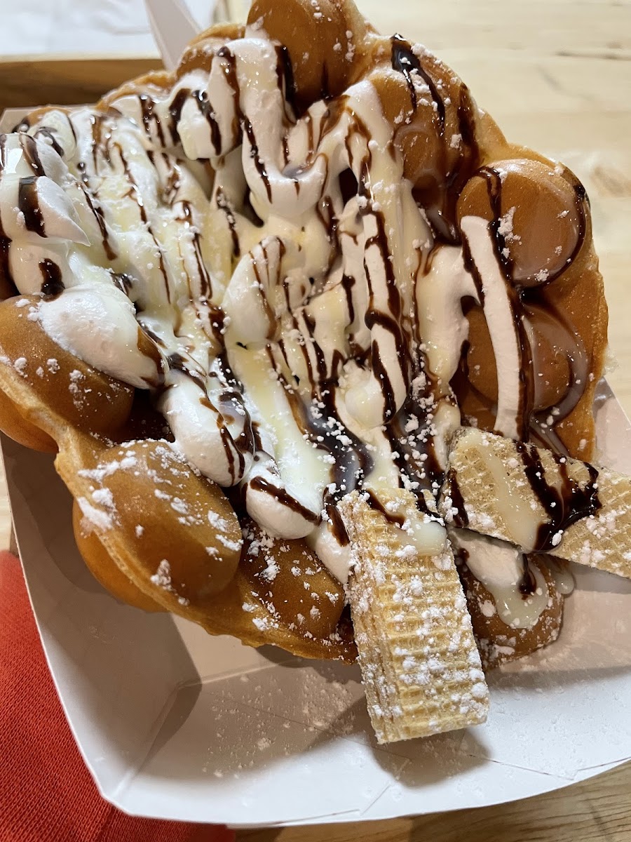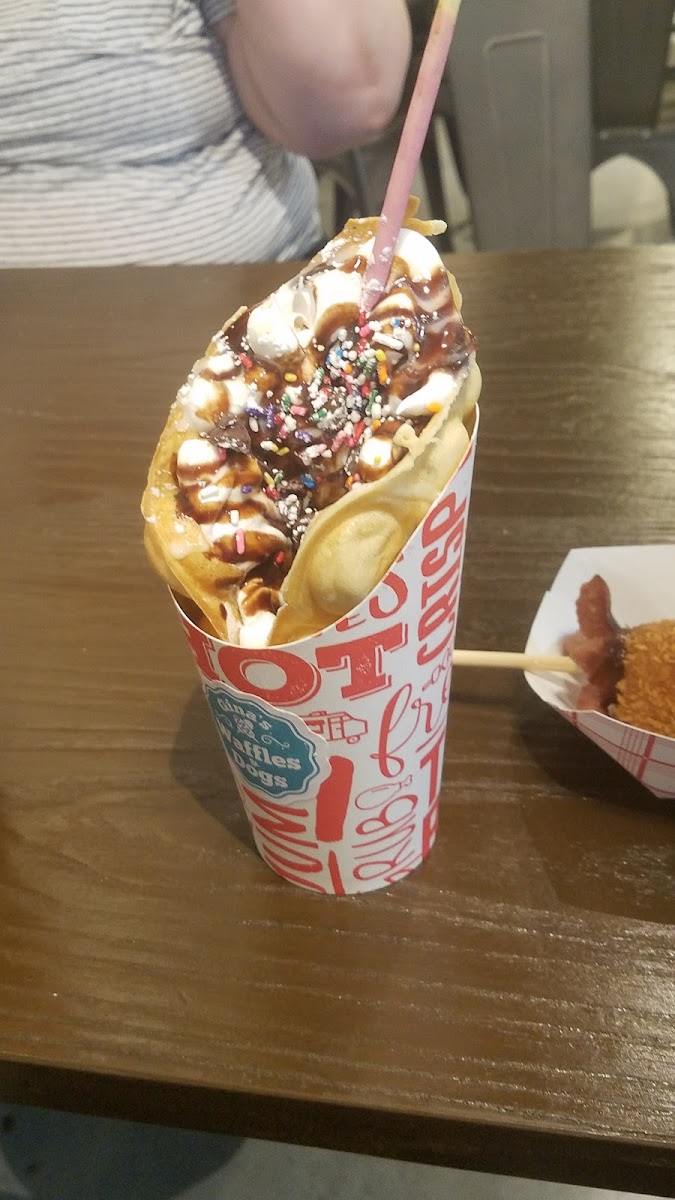 Sweetest little place that I have ever been to! My daughter wanted to eat here because they serve Korean corn dogs. And I got all excited because I have seen them made on YouTube so I was ready to try one. She got the cheese dog and I got half cheese half dog lol. We drizzled the sweet chili sauce over them and they were DELICIOUS!! I couldn't stop talking about it. Then we ordered a bubble waffle cone with cookies and cream ice cream. AMAZING!!!! It was sprinkled with frosted flakes, chocolate drizzle and a vanilla wafer cookie!!! The waffle cone itself tasted amazing I can see myself coming back and enjoying this cute little place.