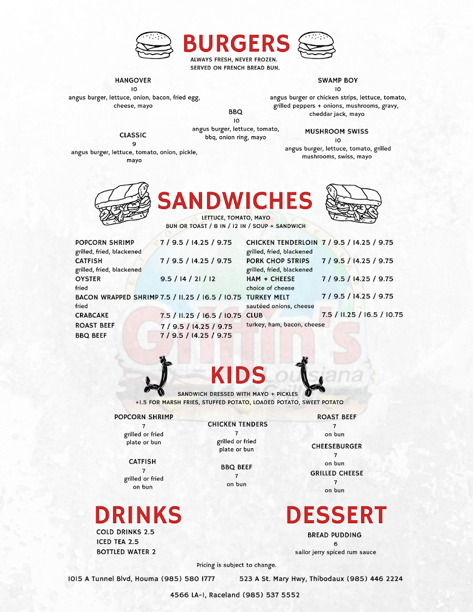 angus burger or chicken strips, lettuce, tomato, grilled peppers + onions, mushrooms, gravy, cheddar jack, mayo