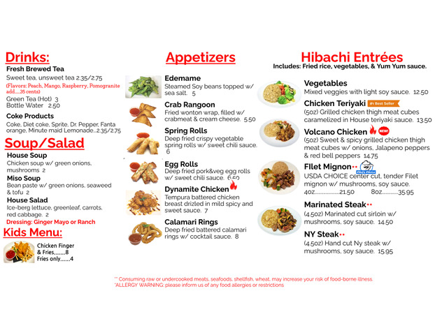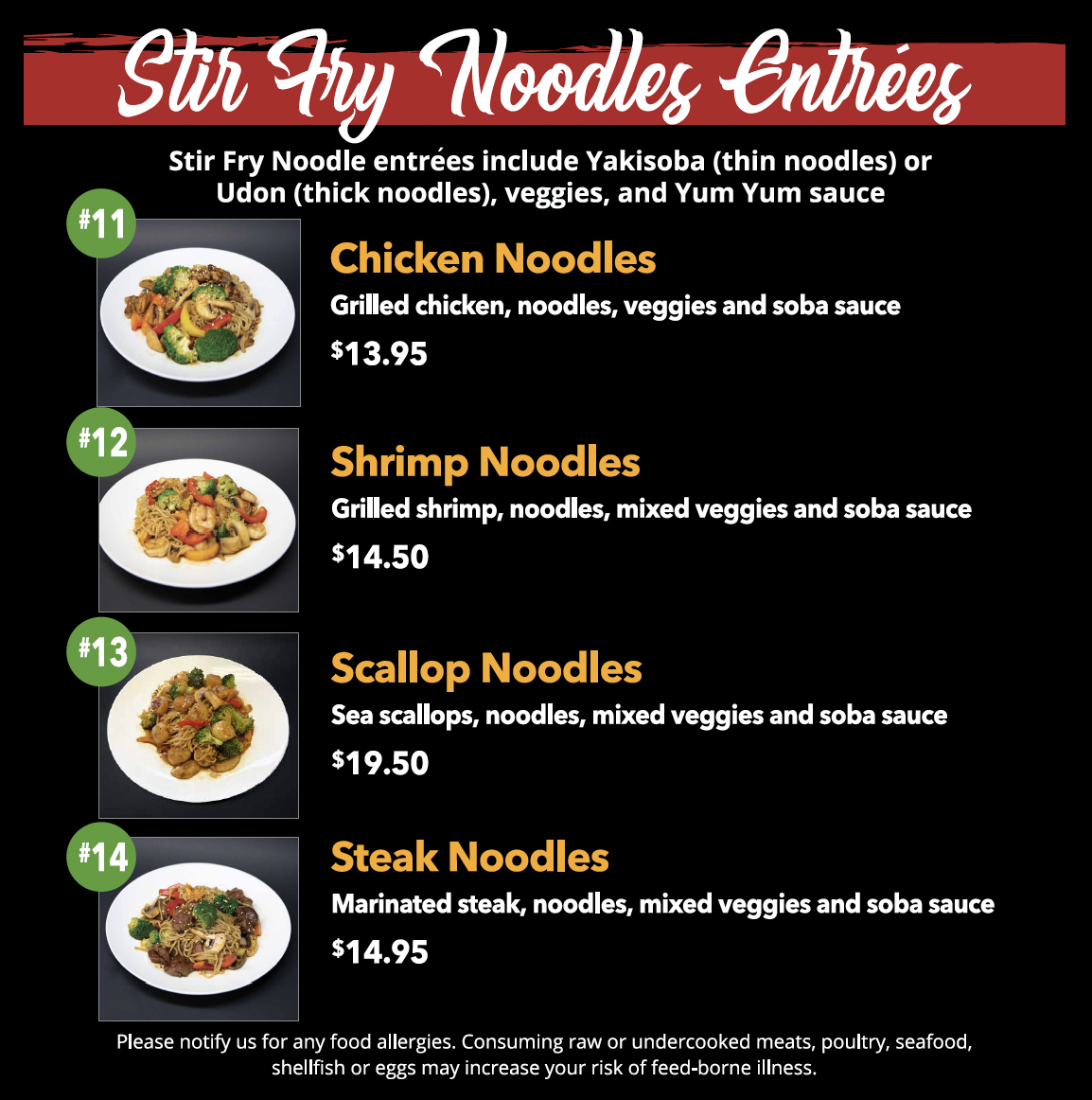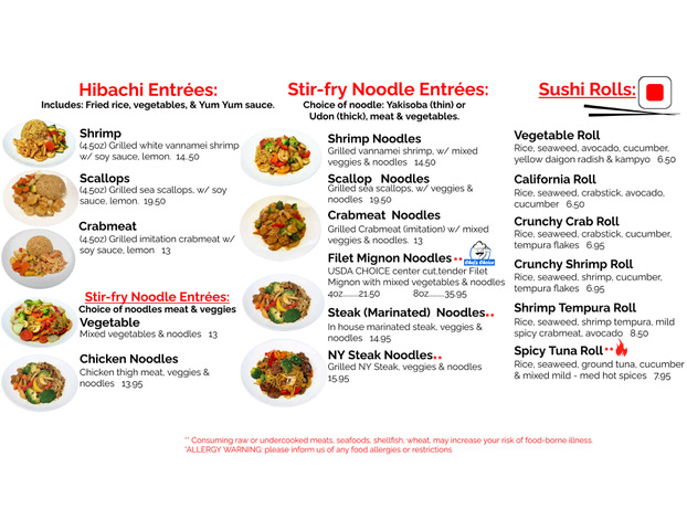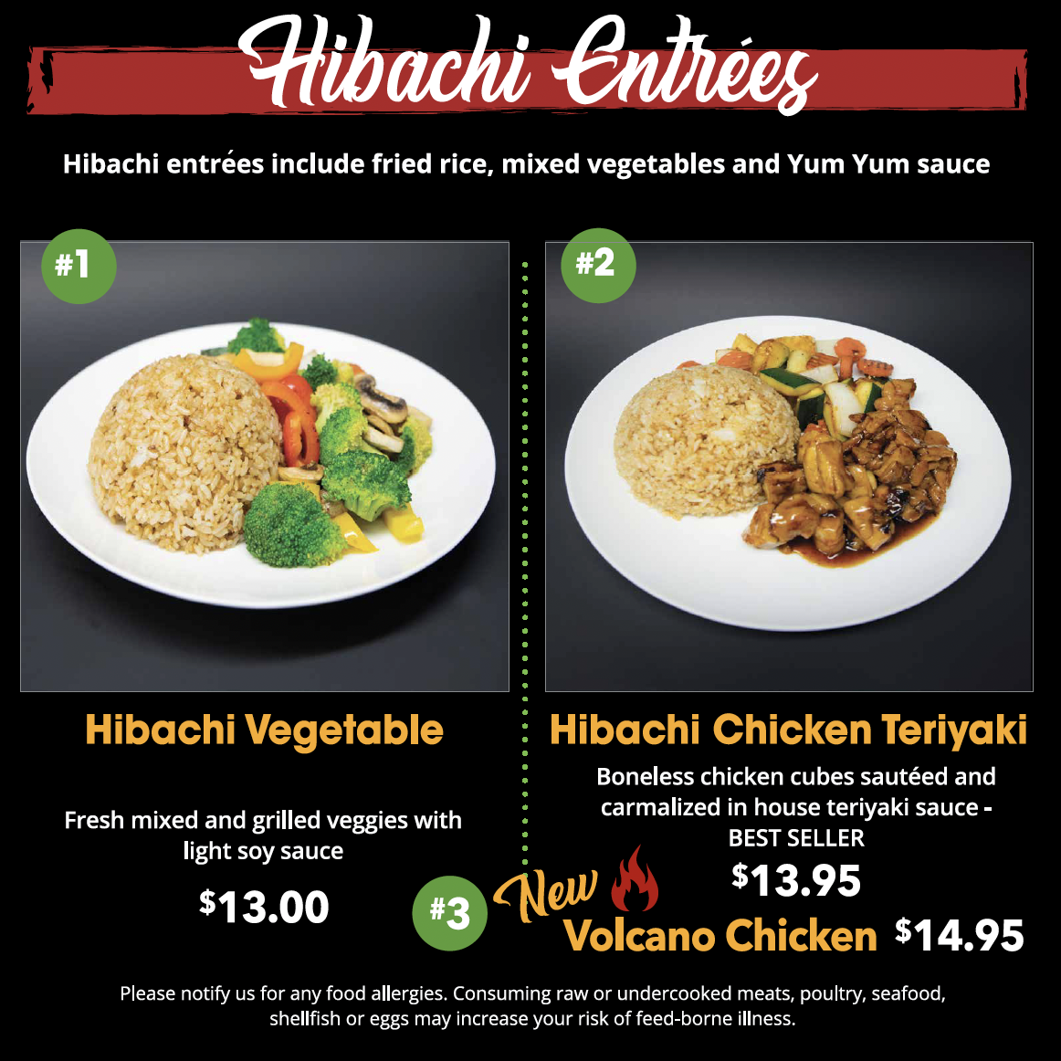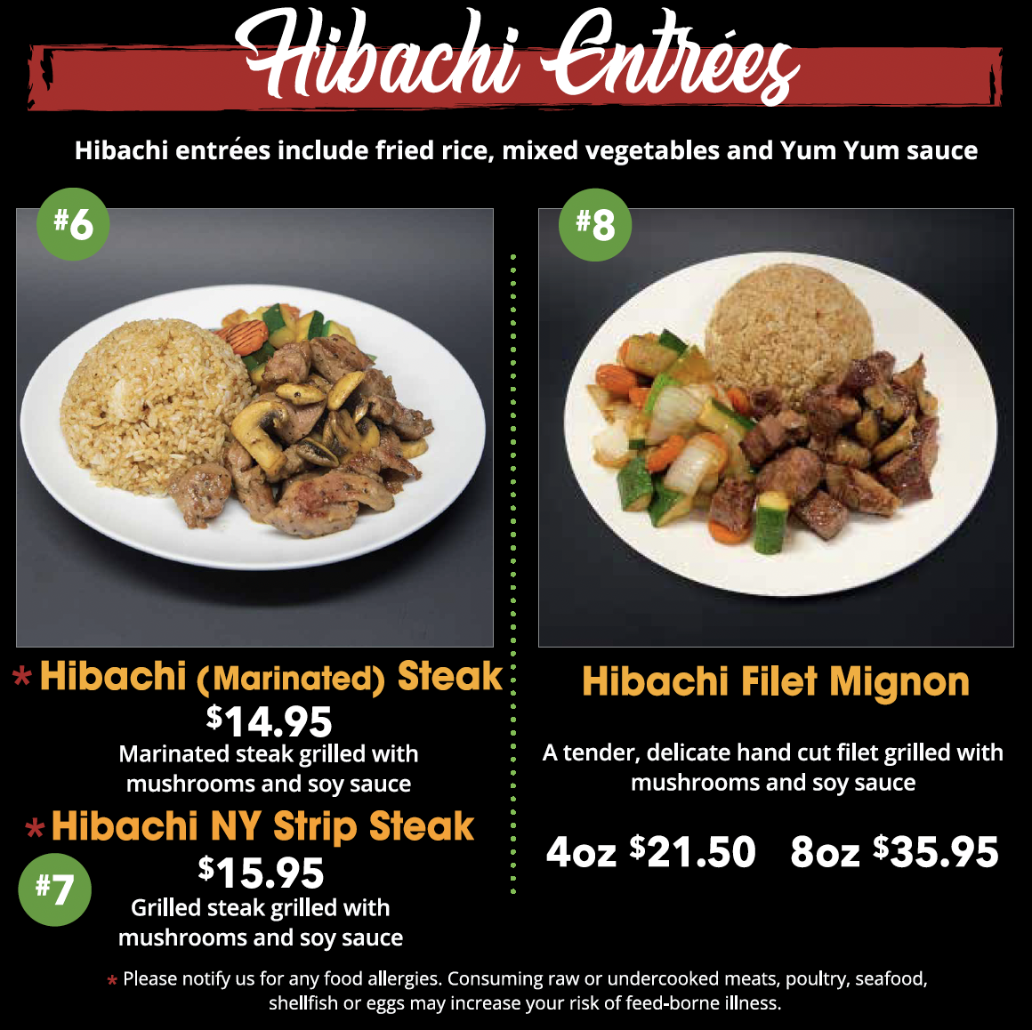Includes: Fried ride, mixed veggies & 4 oz Yum Yum sauce. Marinated cut sirloin steaks w/ mushrooms & soy sauce. (Temp Cook: Well done only)