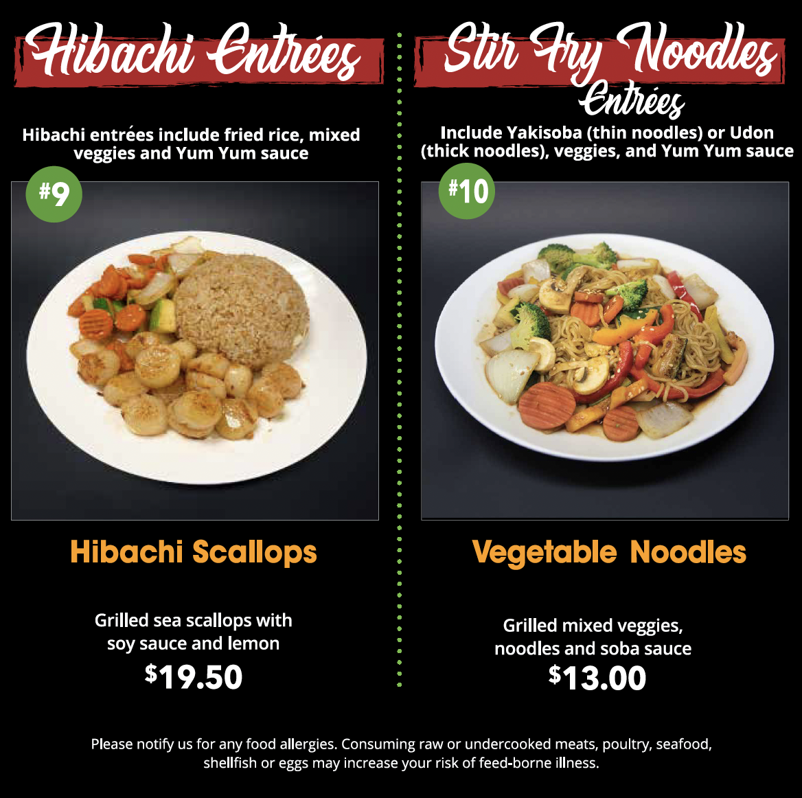Includes: Fried rice, mixed veggies & 4 oz Yum Yum sauce. Grilled & seared sea scallops sizzled w/ soy sauce & lemon Juice.