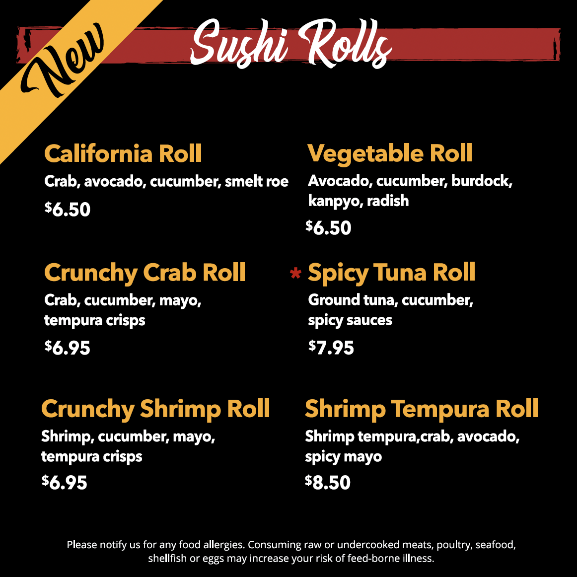 Rice, Seaweed, Shrimp Tempura, crabmeat, Avocado, & topped w/ Spicy Mayo and Eel sauce.