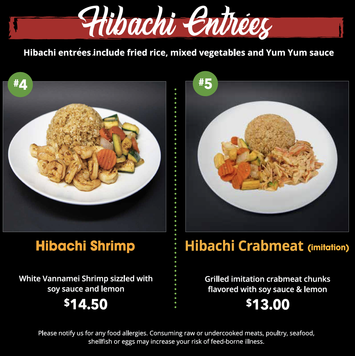Includes: Fried rice, mixed veggies & 4 oz Yum Yum sauce. Flat top sautéed imitation crab flavored with soy sauce & lemon juice.