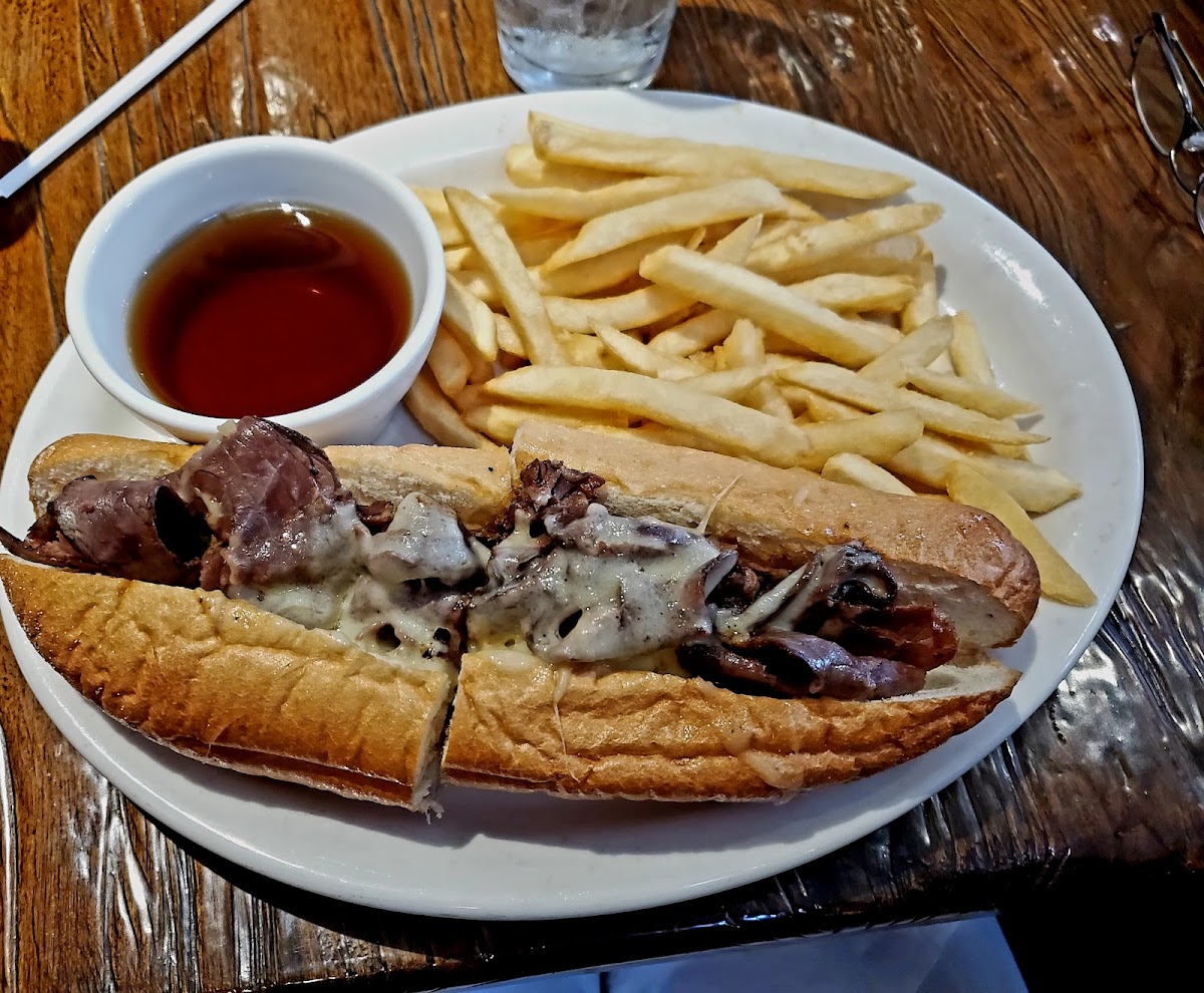 Nice family run restaurant on the edge of Manchester. I got the Delmonaco steak with coleslaw, onion rings and three big shrimp. Lots of good and nicely prepared. My wife got the Steak Hoagie with waffle fries. Huge mound of waffle fries with a big hoagie.y steak was prepared medium as I wanted and pretty tender. Nice place to come for a dinner and have some leftovers for home!