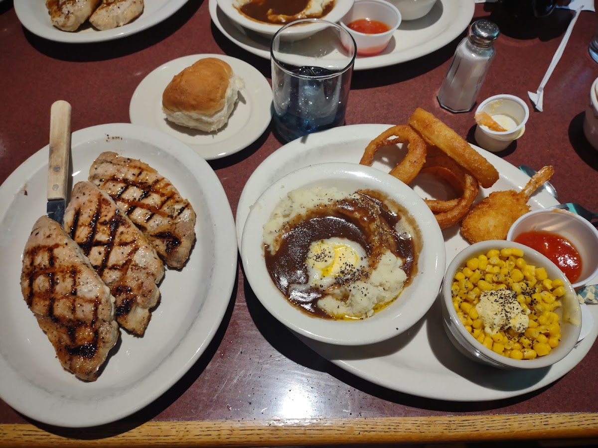 Went in with 6 people to celebrate a birthday. Had great service by our Waitress "Carrie" very friendly, fast service. Lots of choices of food plus "specials". Recommend the pumkin, apple,bacon soup delicious The food came right away, big portions, tasted delicious. Very clean,plus we'll kept bathrooms. Would recommend this restaurant with 2 up. Great job!