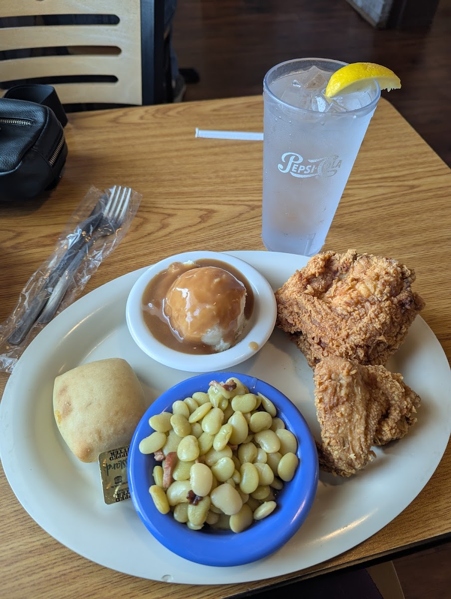 Pleasant service. Food was well seasoned. Had the ranch chicken and fries and my mom had the veggie plate. She got collars, lima beans, rice and gravy, and sweet potato casserole. She said it is all good country cooking.