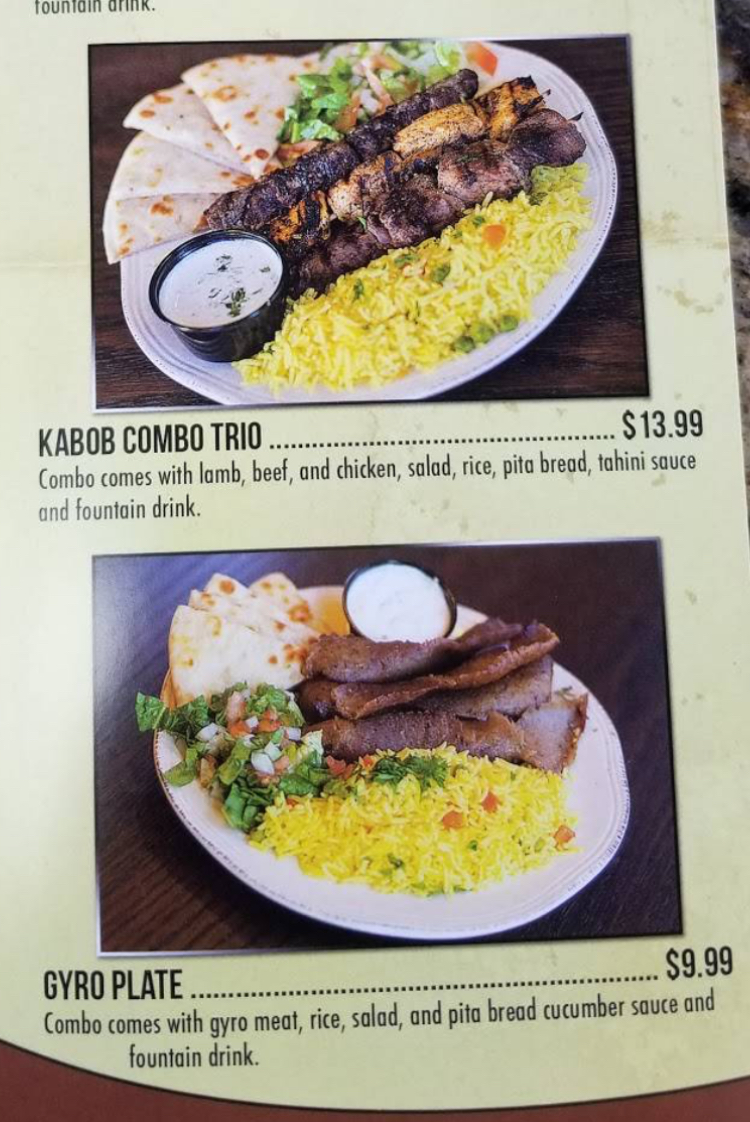 Served with kafta, chicken, beef, gyro kabobs on a bed of rice, salad, and pita bread.