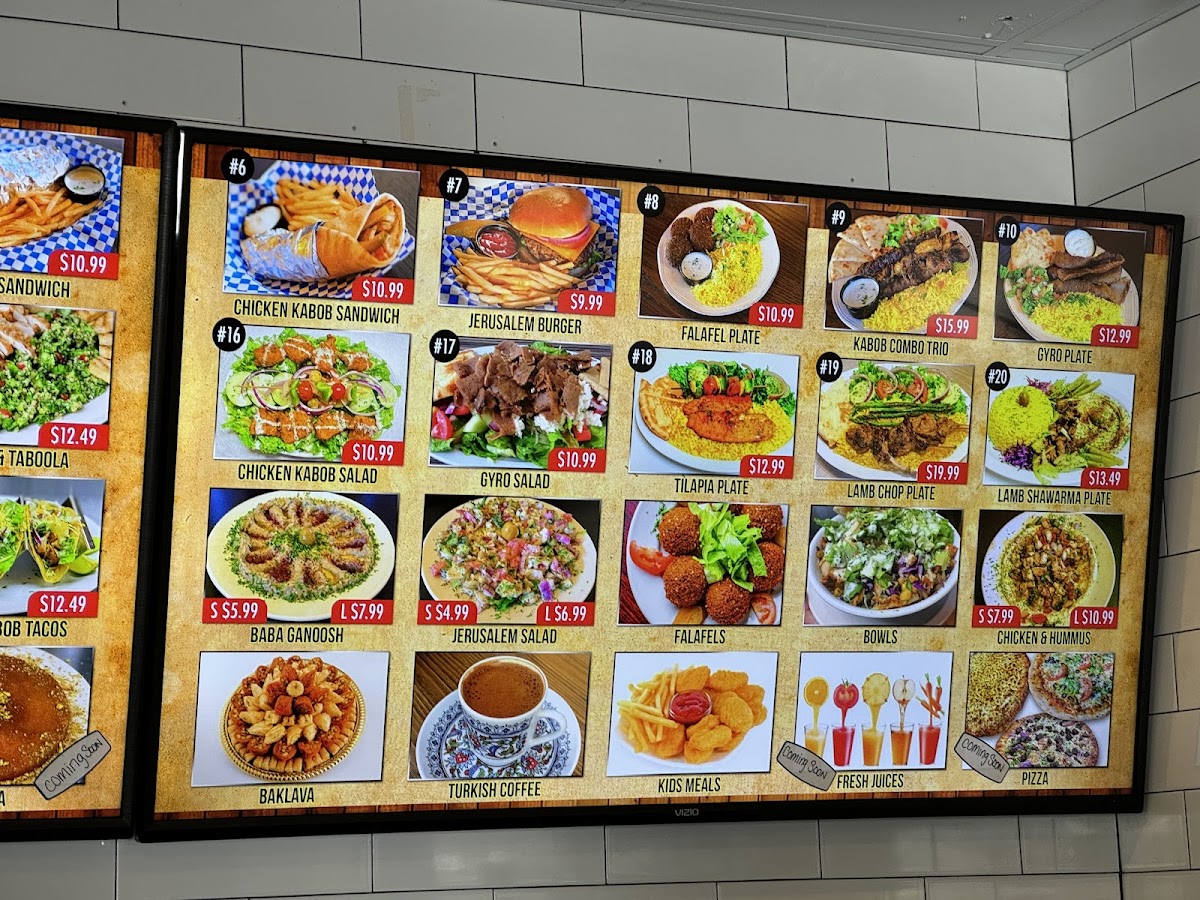 Served with two lamb kabob skewers, rice, Mediterranean salad, and pita bread.