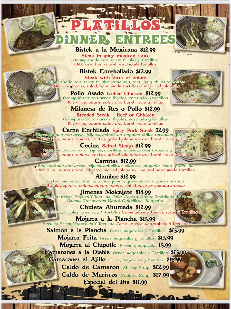 Salsa de cebolla, queso crema con cecina, carne de su preferencia, porción de frijoles. / Onion sauce, cream cheese with salted steak, meat of your choice and portion of beans.