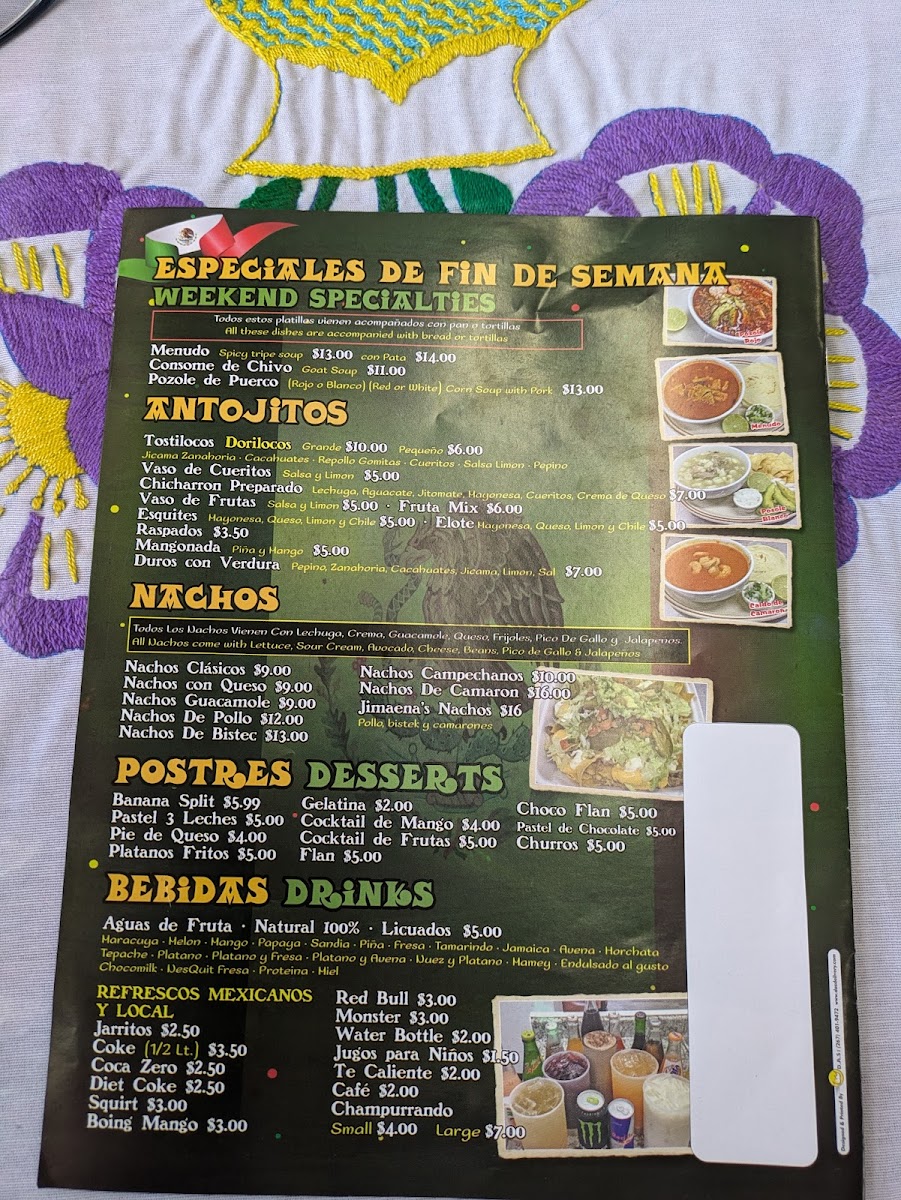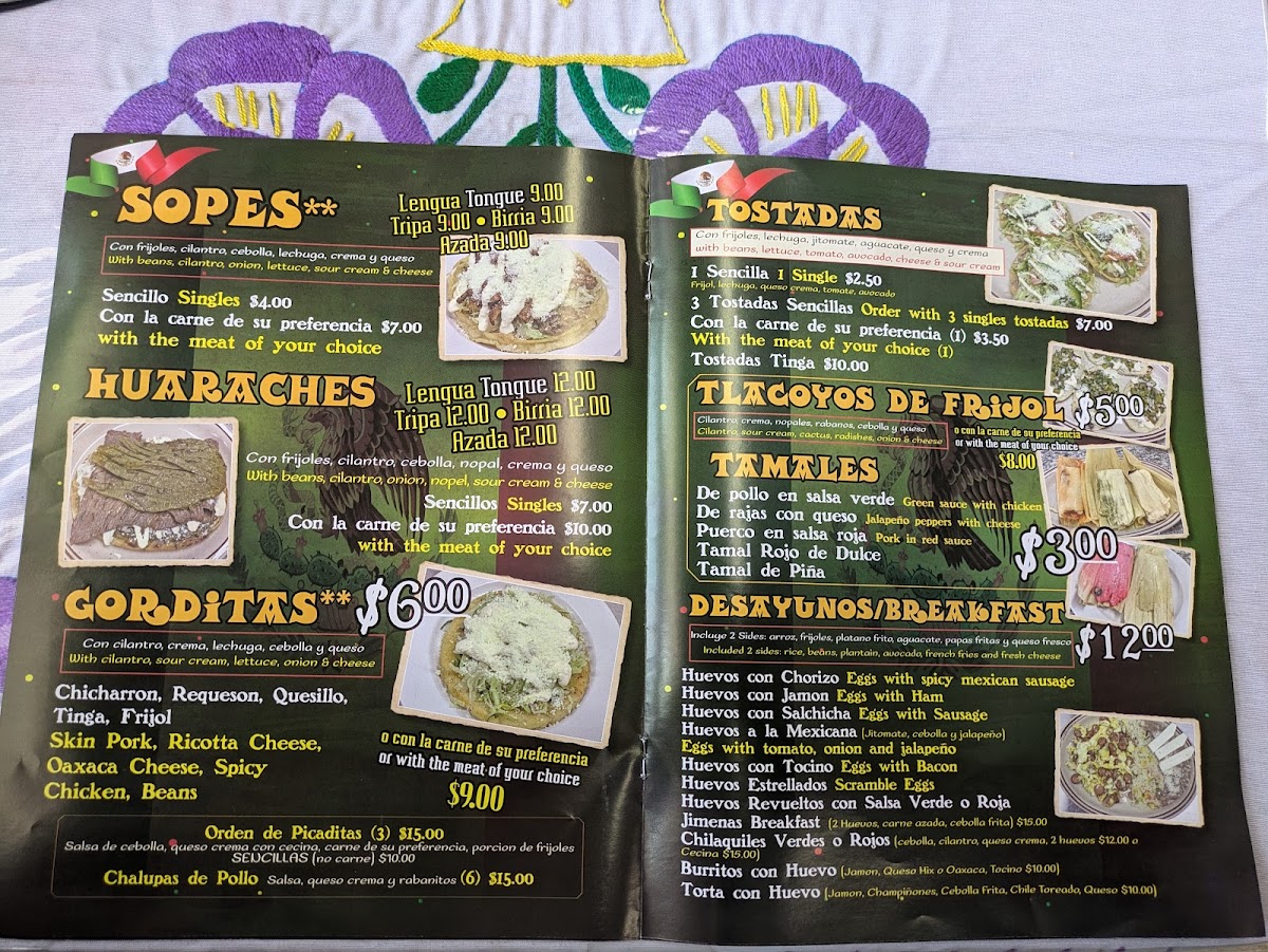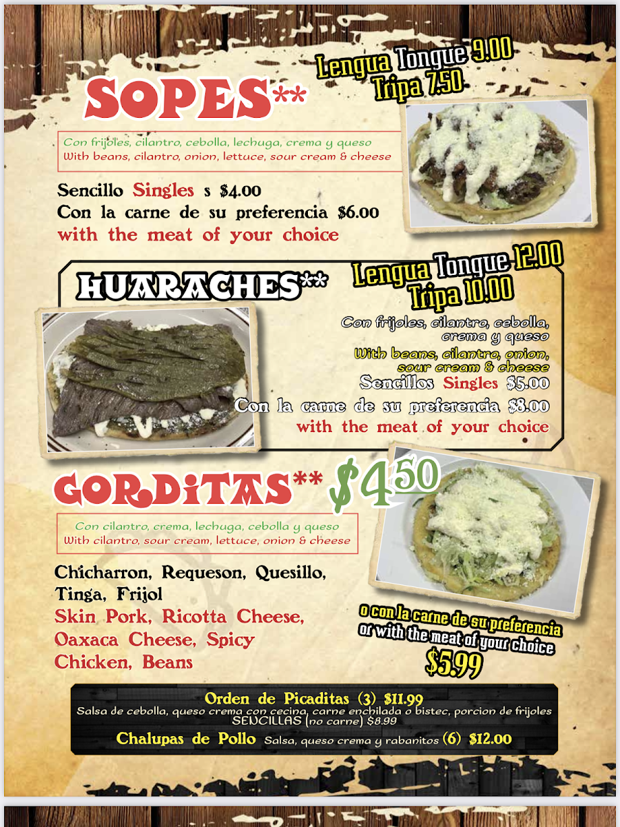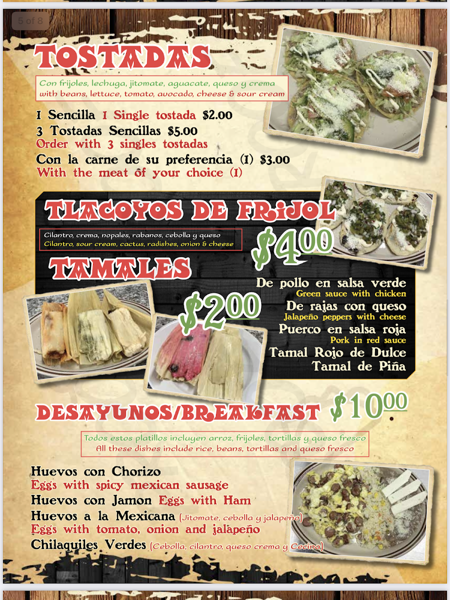 Verde, pollo, rojo, puerco, roja con queso, dulce de piña y fresa. / Green, chicken, red, pork, red with cheese, pineapple dulce or strawberry.
