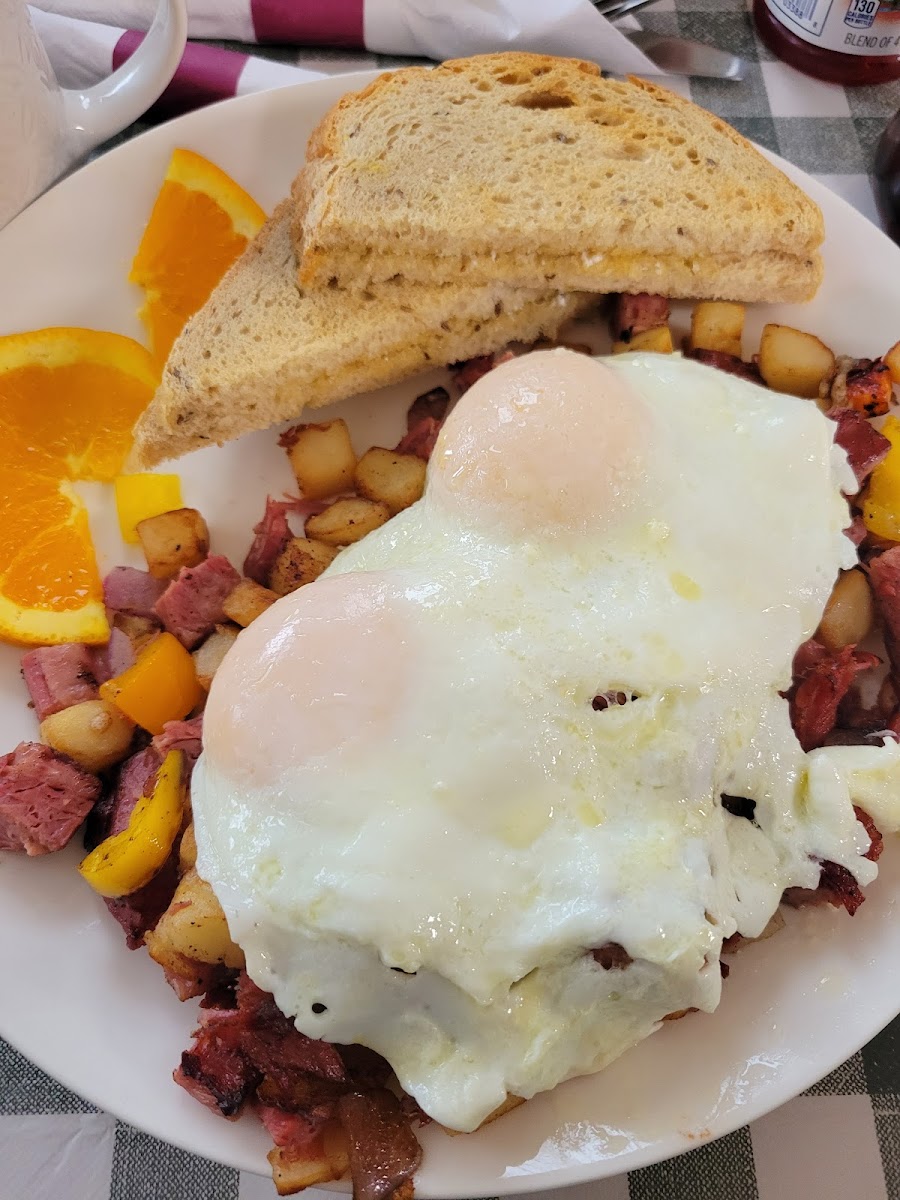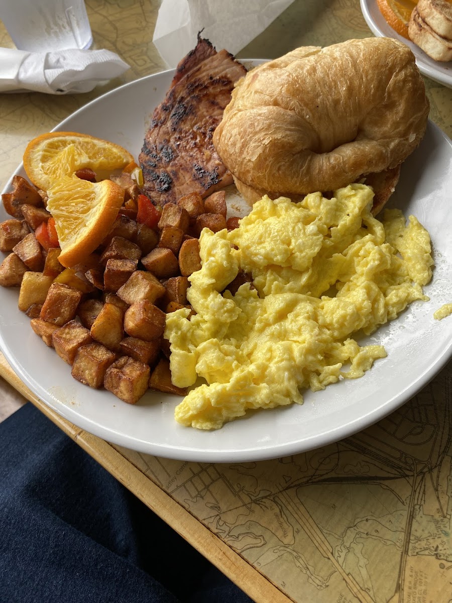 We had breakfast here yesterday morning. We had a bit of a wait for a table, maybe 20 minutes or so but it was pleasant to wait. We were seated in the dining area on the outside wall with nice views of the river. Our young server was sweet and helpful and as prompt as she could be given the number of tables she was running. I ordered a juice and was shocked at the size, at least 12 ounces of juice with no ice (yay) was served! I had two eggs poached with sausage and they were very good. It was served with hash browns that were made with onions and red peppers, a nice addition.
