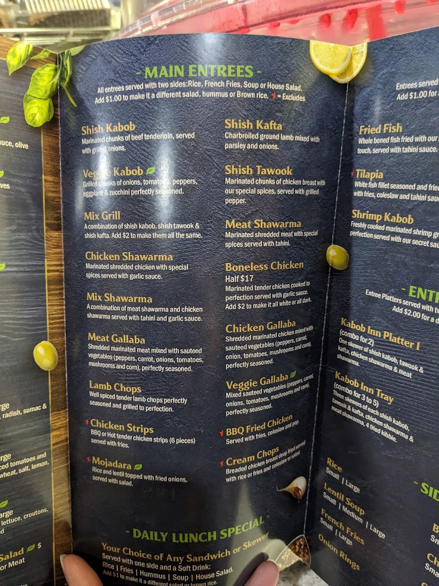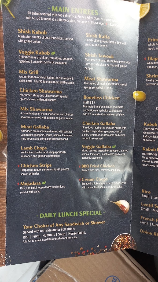 Served with one side and a Soft Drink:Rice | Fries | Hummus | Soup | House SaladAdd $1 to make it a different salad or Brown rice
