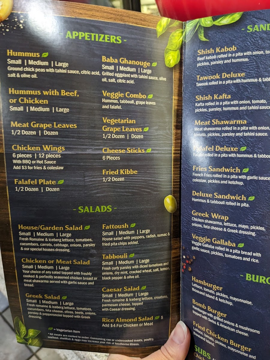 Veggie Grape leaves rolled in a pita with hummus, Lettuce, Tomato, and Pickles.