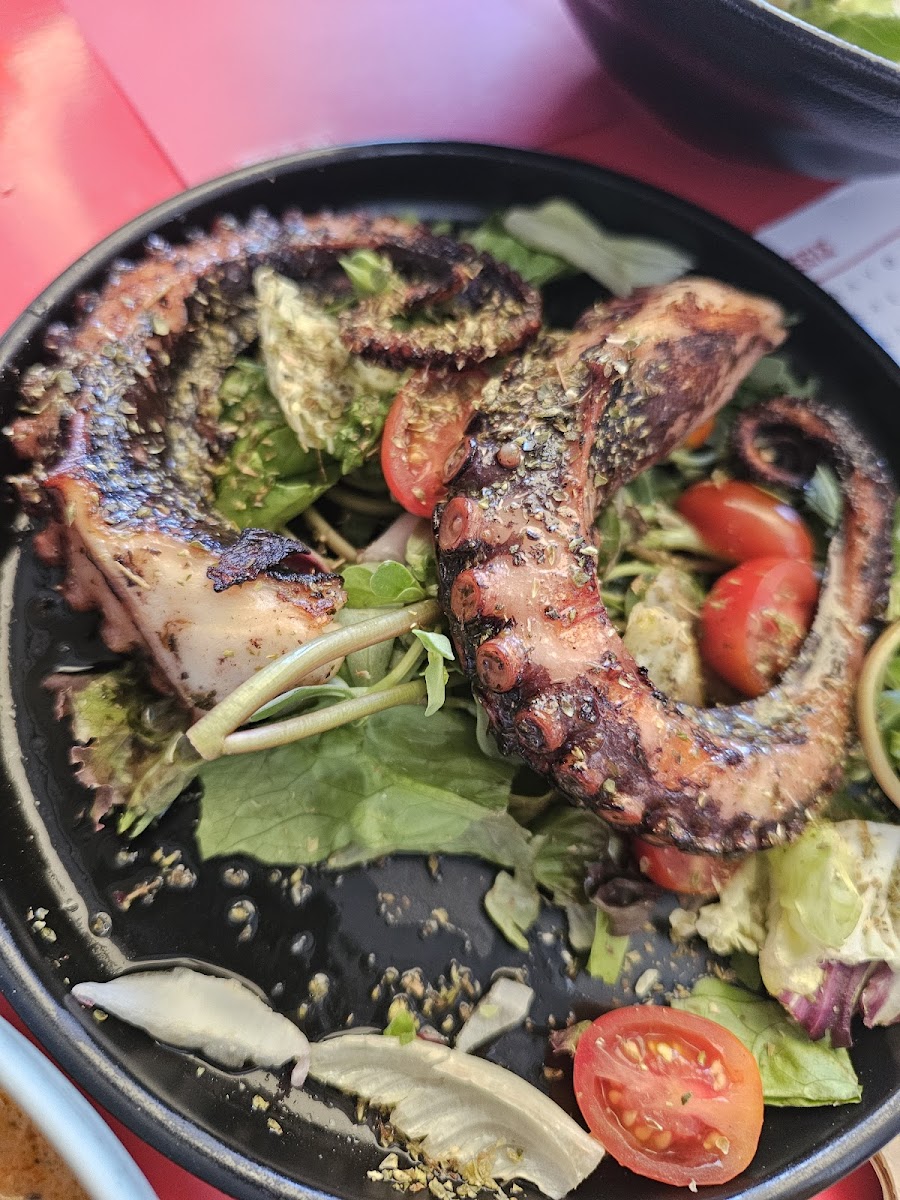 Authentic food, large portions, reasonable prices and friendly quick service. We enjoyed a lovely lunch here. The menu is large and if we had time I would have loved to go again to try more items. The squid & zucchini had an amazing black garlic sauce - so delicious! The fried cheese with honey was hot, crispy and gooey. Highly recommended!
