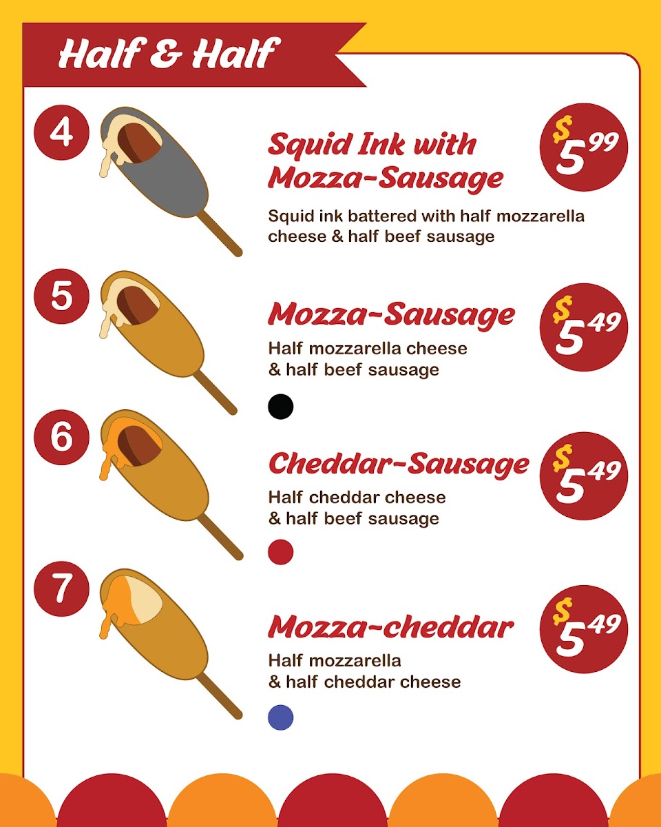 Squid ink battered with half mozzarella cheese and half beef sausage.