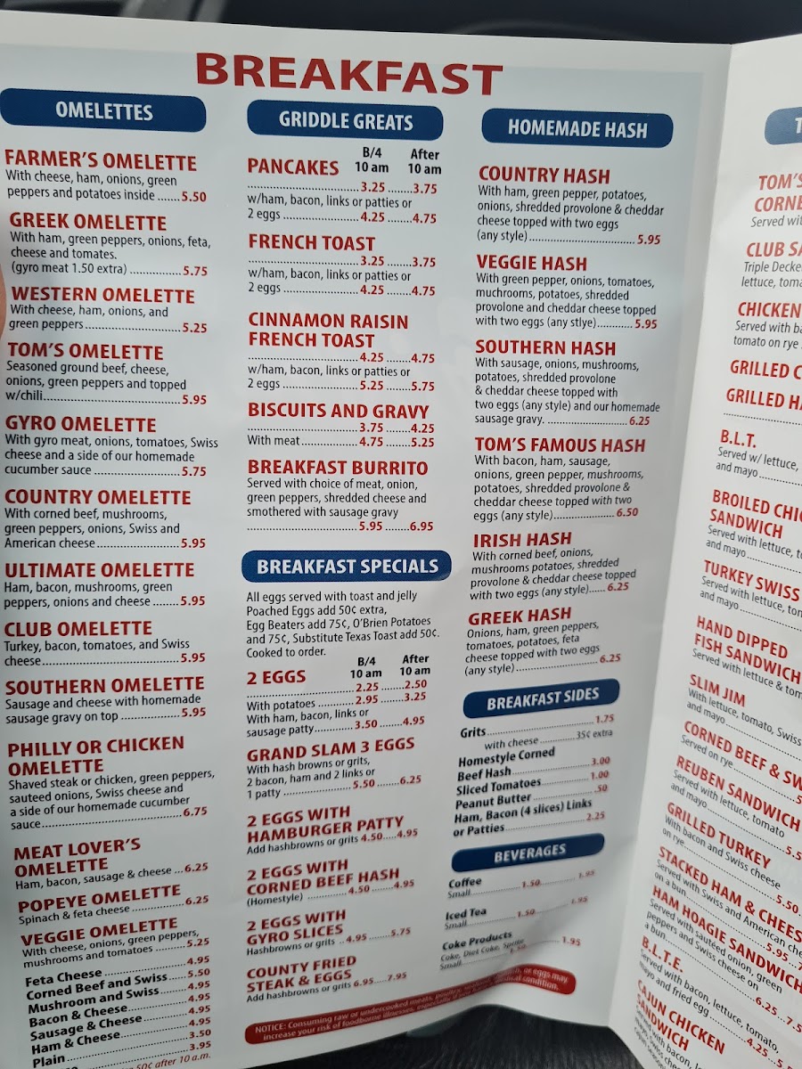 Three eggs, hash browns, grits, 2 bacon, 2 sausage, ham, pancakes or french toast.