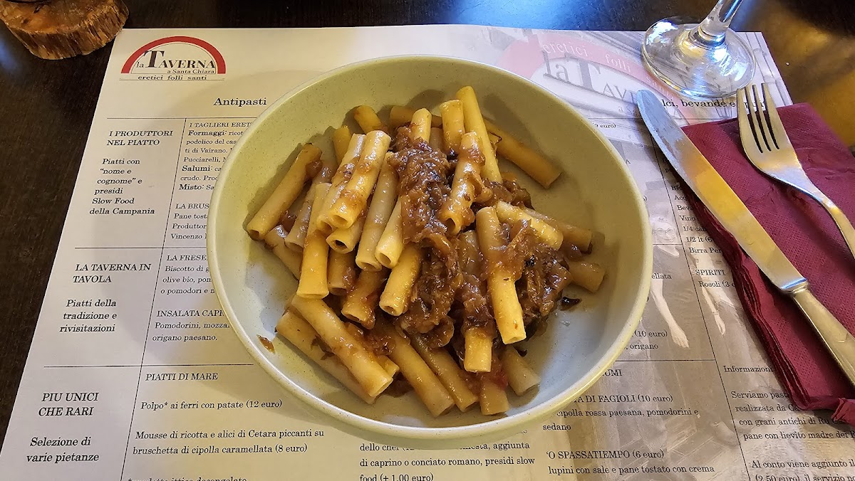 The people here are incredibly warm, welcoming, and full of that authentic Neapolitan spirit that makes you feel right at home. The ragù was hands-down the best I've ever had: rich, slow-cooked perfection that clings to the pasta in the most delicious way. Every bite was pure comfort and flavour was sad when my bowl was finished. Very worth visiting if you're craving genuine, soulful Campania cooking. I'll be back next time I'm in the city highly recommend La Taverna di Santa Chiara!