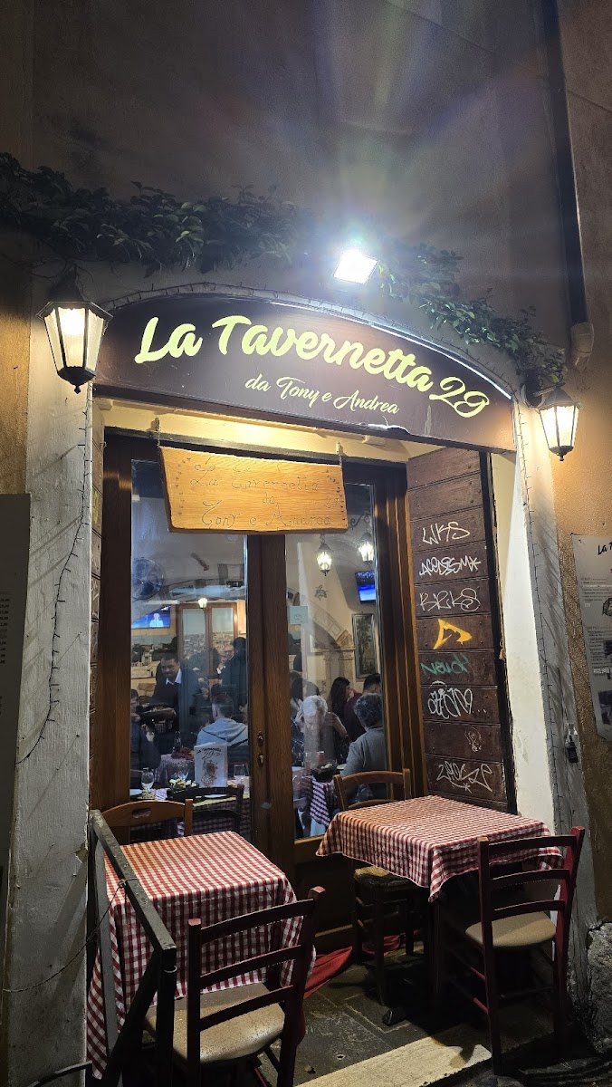 La Tavernetta 29 Da Tony E Andrea is a restaurant located at Via della Pelliccia, 29a, 00153 Roma RM, Italy. It has garnered 5,879 user reviews. Highlights on the menu include Bread, Tiramisú, Coda Alla Vaccinara, Sautéed Mussels, and Vino Della Casa. The restaurant is generally accessible without a wait except on Sundays when there can be a peak wait of up to 15 minutes between 6:30 PM and 9:00 PM.