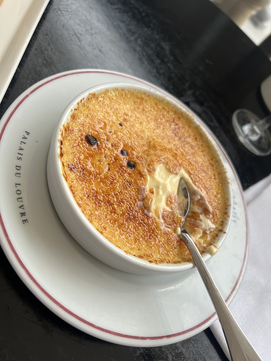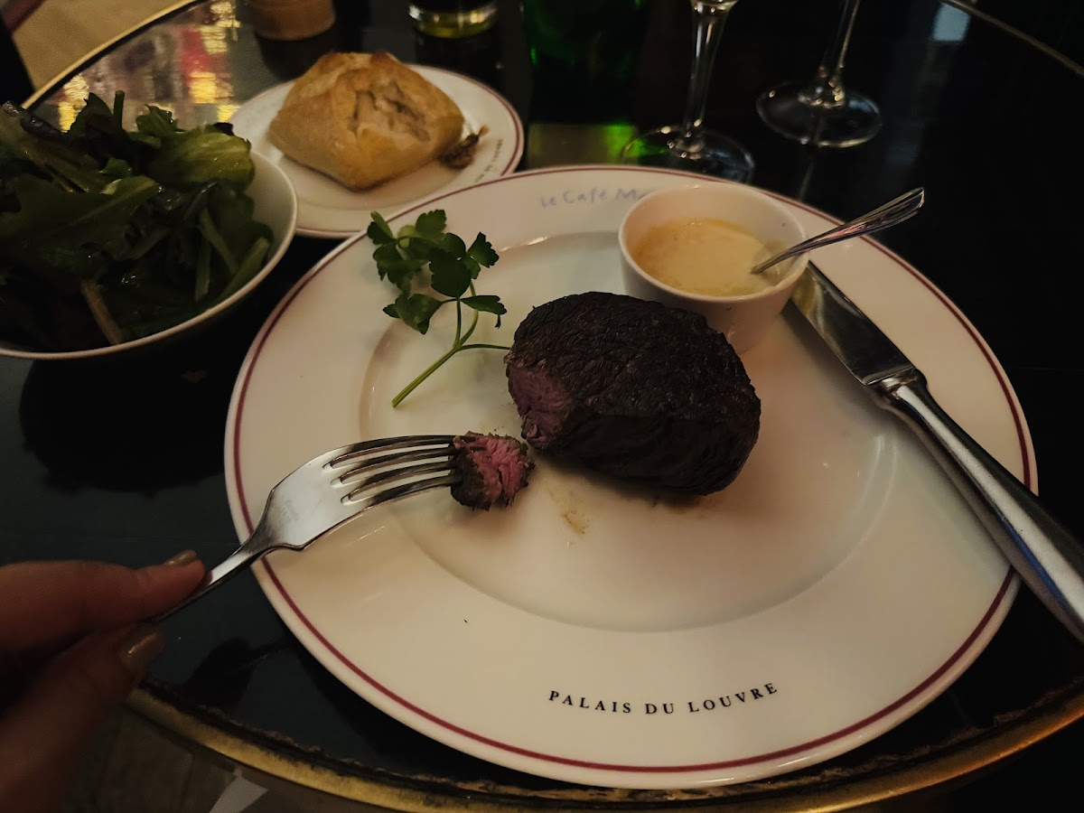 We made a reservation in advance, which turned out to be essential. Even though we arrived on time, we were asked to wait a couple of minutes while they confirmed a table was available, so I would definitely recommend booking ahead. The staff were friendly and helpful, and the service overall was good. What really stood out to me, though, was the atmosphere. There are outdoor tables overlooking the Louvre courtyard, which is great if you enjoy the open air and the buzz of people, but it felt a bit crowded for my taste. We chose to sit inside, and that’s where the magic was. The interior has a very authentic French feel with dark red walls, golden detailing, large chandeliers, cherrywood tables, and an old marble fireplace. It felt elegant, warm, and truly charming. For dessert, I ordered an apple pie expecting the usual thick crust with a small apple filling. Instead, I got the Parisian version and absolutely fell in love with it. It was a delicate disc of sweet puff pastry topped with thin slices of apple, served with a small scoop of rich vanilla ice cream. Light, elegant, and delicious. I would definitely recommend it.