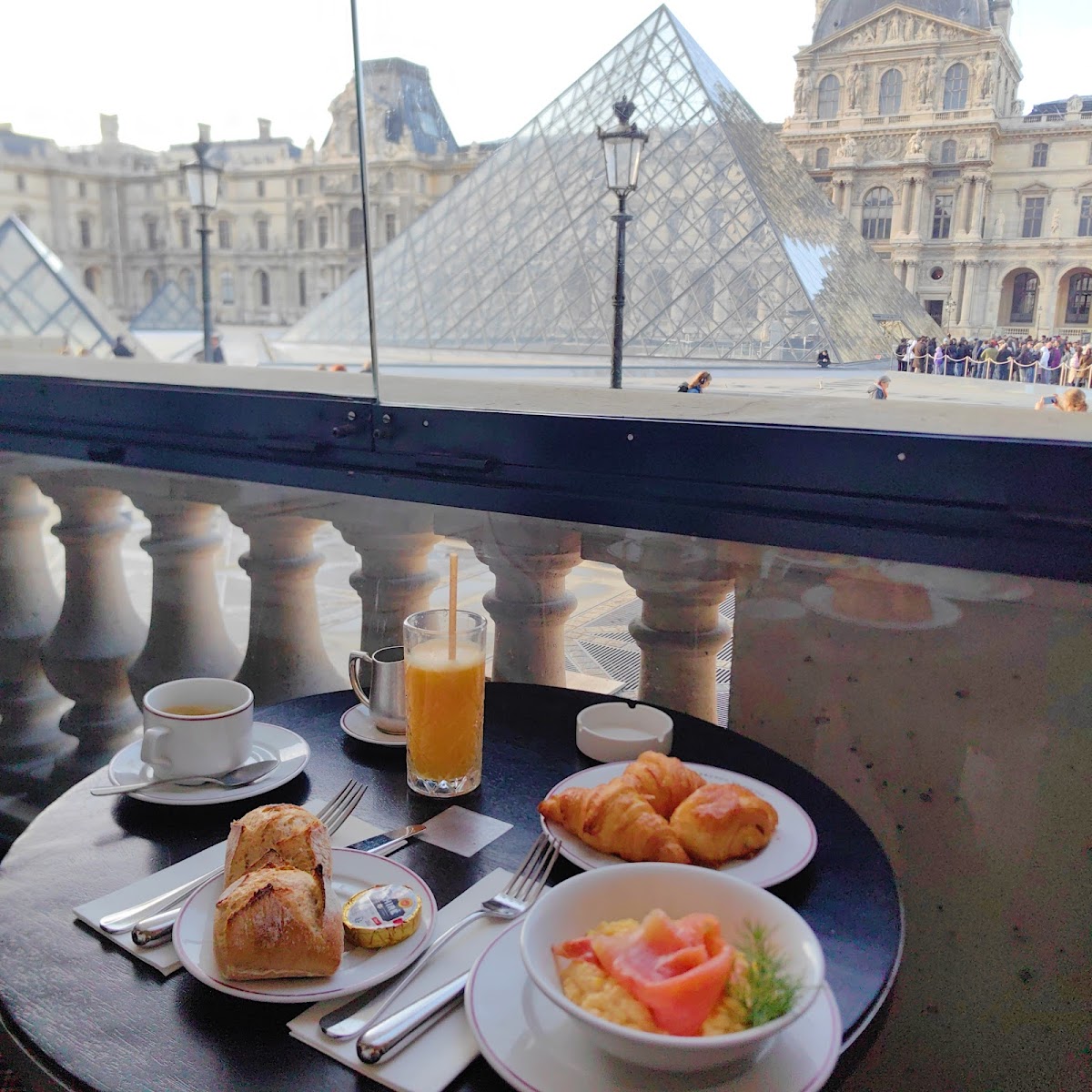 A fancy cafe with amazing view of the Louvre pyramid . Food was ok but could do with more vegetarian options. We went as a family about 1pm. Book ahead to make sure you can sit outside on the website. We ordered the soup of the day (pumpkin), a croque monsuier without the ham, the spinach lasagne and the spicy tomato riggatoni. Thw food was decent with good flavours and lots of cheese! Soup was flavourful and sweet with a nice spicy warmth. The riggatoni was probably the best with a rich tomato flavour. The spinach lasagne was nice but loaded with cheese. The monsuier looked impressive and tasted fair. It is a shame there are limited vegetarian and no halal options which limited us. They ran out of eggs which was a real disappointment. Service was decent. The toilets are interesting as up 3 sets of stairs. The view however is amazing and worth a trip if only for a coffee and dessert (which looked impressive). Amex friendly.