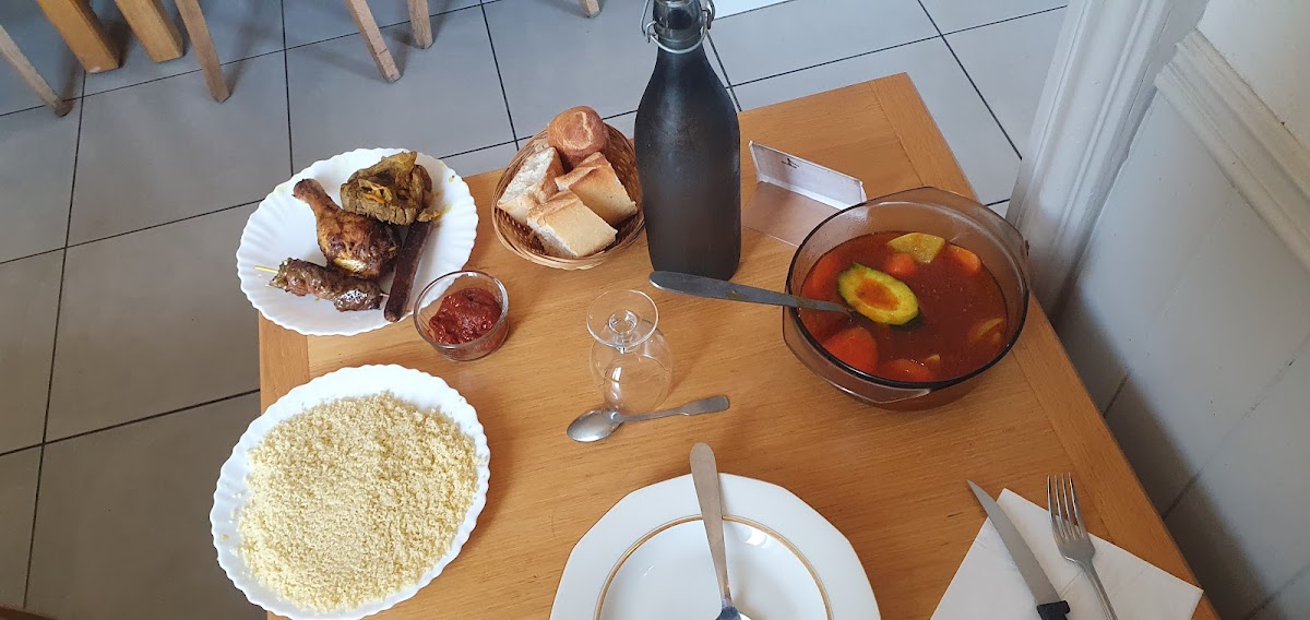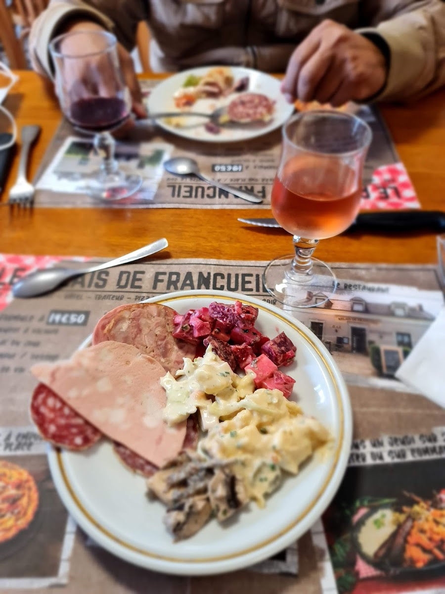 Just like one of the good old 'Les Routiers', complete with a dozen or more big artics in the car park. 4 courses plus wine for €14.50. Not fancy food, but done well and generous portions. Mousse au chocolat and creme puddings were outstanding. The owner and truck drivers near us were great fun.