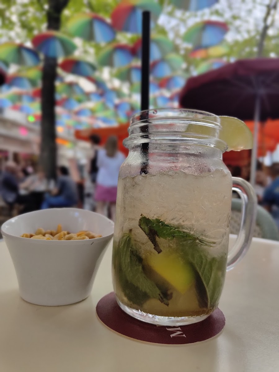 ….We came out today to wonder around the streets of the La Marias Area and just as we passed this very full restaurant the heavens opened! We ducked under the terrace canopy for a moment and lo and behold in a tight nif-tii corner was an open table for four! Shoo we were in! They have a huge selection of foods on their menu-card! We ordered Sparkling Water, a Carafe of House Red Wine to share. Seeing that it was cold and wet we decided to try their Onion Soup which I believe is a very French dish with a plate of chips & bread We enjoyed everything here! Soup was delicious filled with croutons and cheese. Service was excellent and the vibe was good. They have seating inside too upstairs and downstair. A visit here is a must…