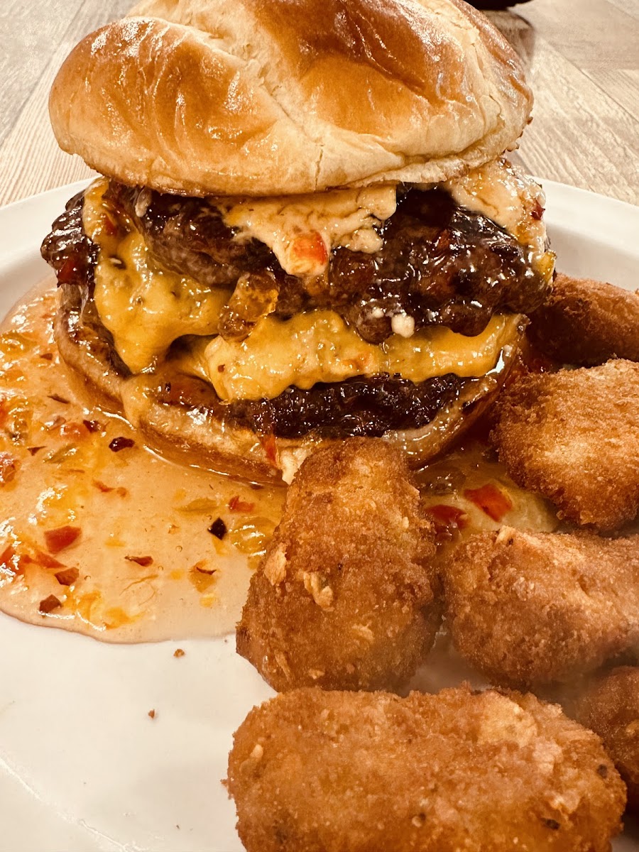 Had late lunch with a friend. He had deep fried ribs with fries and a salad. I had double bacon cheeseburger with fries. His salad as a full crisp lettuce with shredded cheese and two small tomatoes. The waitress came by and explained the would be a slight delay due the and order of fried chicken was in the fryer first. The wait was not that long. The deep fried ribs looked and smelled delicious. She explained they were using a beer batter recipe. The ribs had a good portion of meat on them for an order of six. Very tender. My double bacon cheeseburger was very large and high speared through the top with a knife. Everything was beautifully kept within the bun and not all hanging out. The chef took time with the bacon to keep it round as it was cooked. Good sized patties and done to medium well. Not dried out. We both had fries and these also was crunchy on the outside and fluffy tender on the inside. No salt placed on them until the customer decides, which was nice. These were not your fast food fries, they were much better. First time here. Clean and cozy. They did a great job setting and decorating. Encourage to go again and see what else they decide to try.