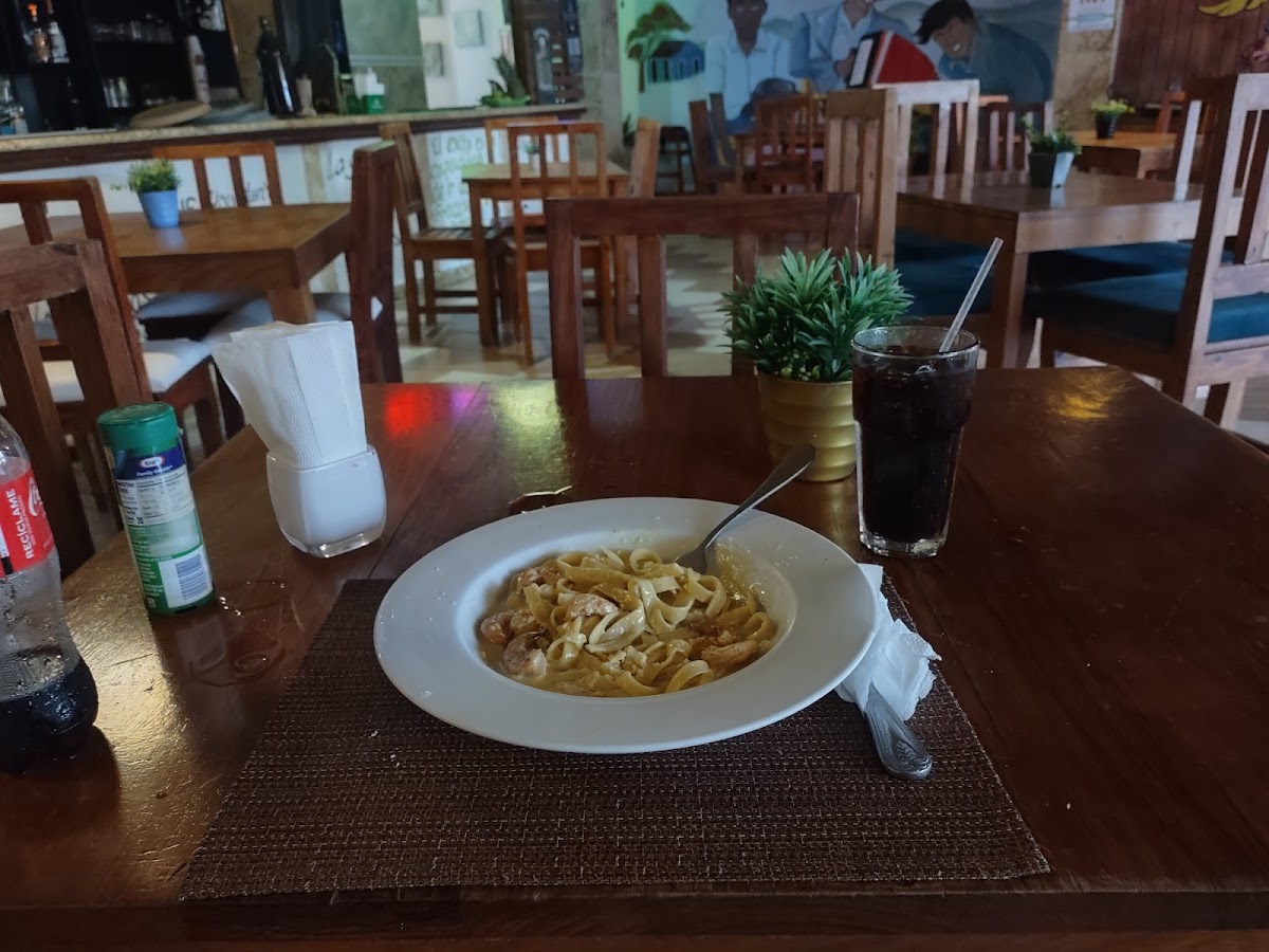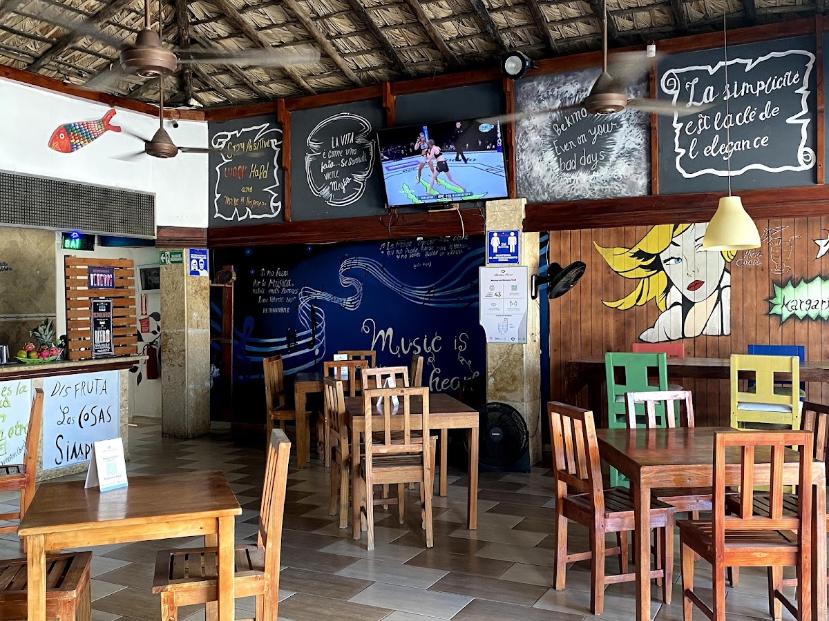 This is a nice outside/inside restaurant in the busy tourist area of Boca Chica. I went to the market next door and they suggested we have dinner there. The staff was very welcoming, it wasn’t busy and there was a live dj, a bar and large televisions with interesting quotes on the wall for entertainment. There was a bit of a wait for our food so prepare your patience but majority of the food was worth the wait. The curry coconut shrimp was so delicious. There is a language barrier but anything we needed, it was handled and addressed right away. I think the best part of this restaurant was the service, everyone was very helpful and professional. So that was nice. Overall I was pleased with the experience. I really played myself ordering the bbq wings and then I took them to go as if I would eat them another time. Either way you can come here to expect a nice atmosphere, fairly okay prices and an enjoyable experience. I would recommend others coming here and I would highly recommend the shrimp. The snapper was delicious as well. You can tell the food was definitely cooked fresh and coming here added to our trip in town. Thank you so much!