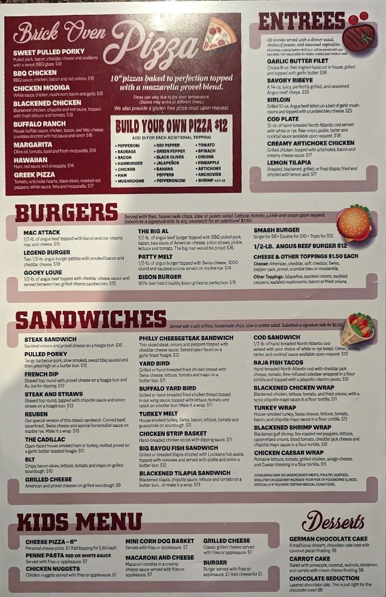 Toppings $2 each: chicken, sausage, hamburger, ham, or pepperoni; $1 each: red or green peppers, black olives, jalapeños, onions, tomato, mushroom, spinach, or pineapple. Sour cream and salsa upon request.