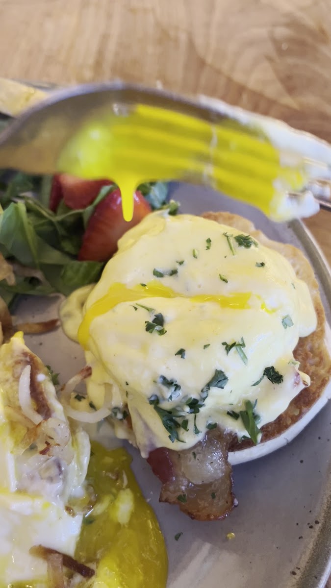 The Eggs Benedict is absolutely delicious. Although there was bacon instead of traditional Canadian bacon, it was an absolute delight. As you can see from the video the eggs were cooked perfectly. Amazing service, quiet atmosphere.