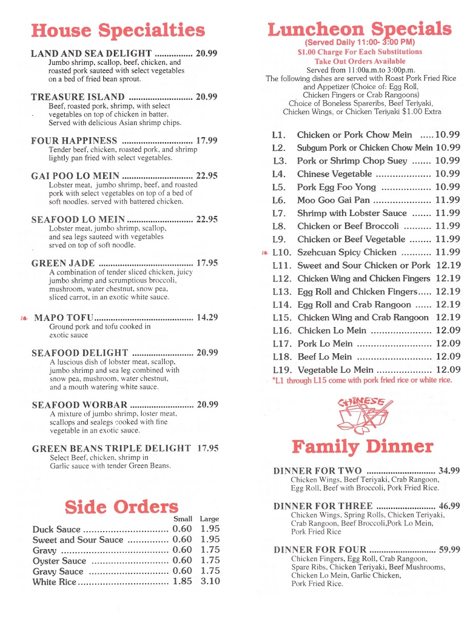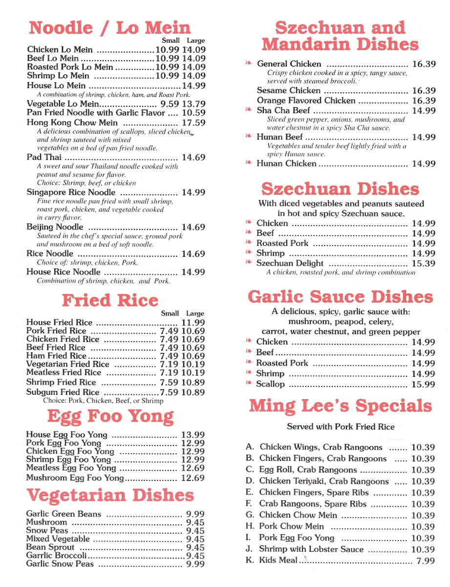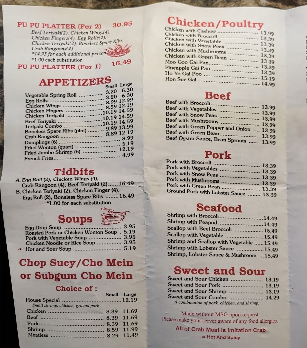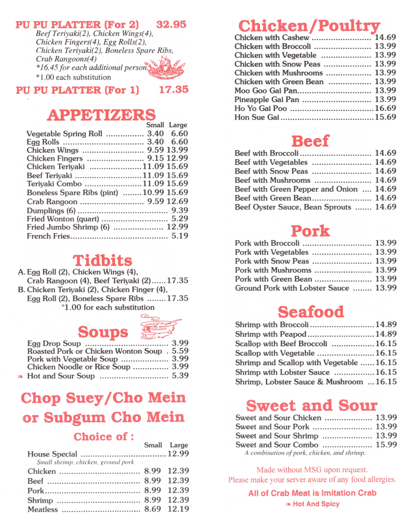 Chicken Wings, Spring Rolls, Chicken Teriyaki, Crab Rangoon, Beef with Broccoli, Pork Lo Mein, Pork Fried Rice