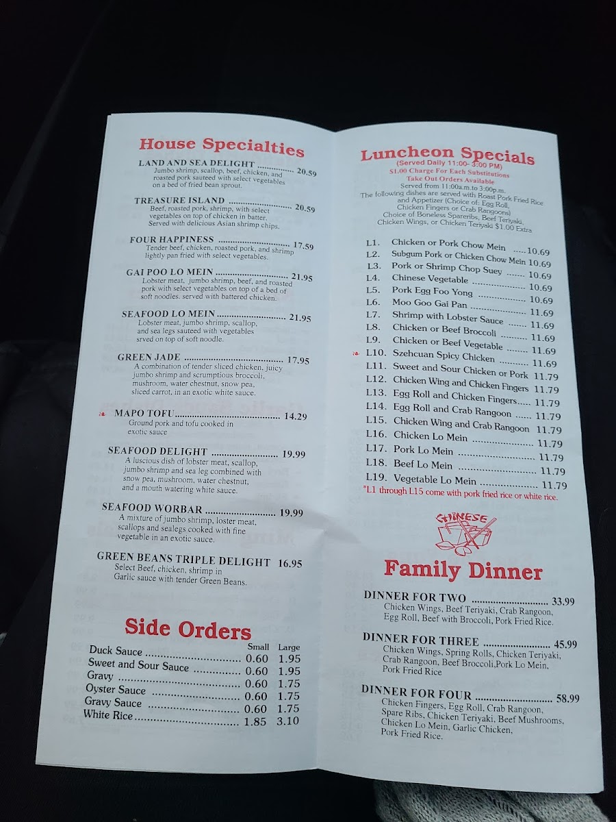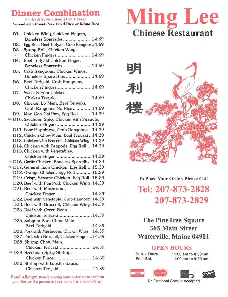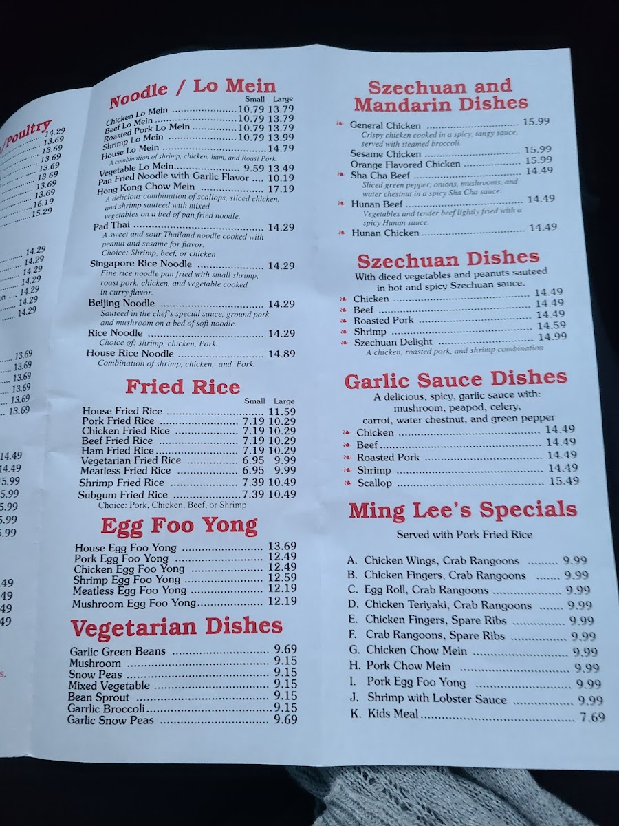 Chicken Wings, Spring Rolls, Chicken Teriyaki, Crab Rangoon, Beef with Broccoli, Pork Lo Mein, Pork Fried Rice