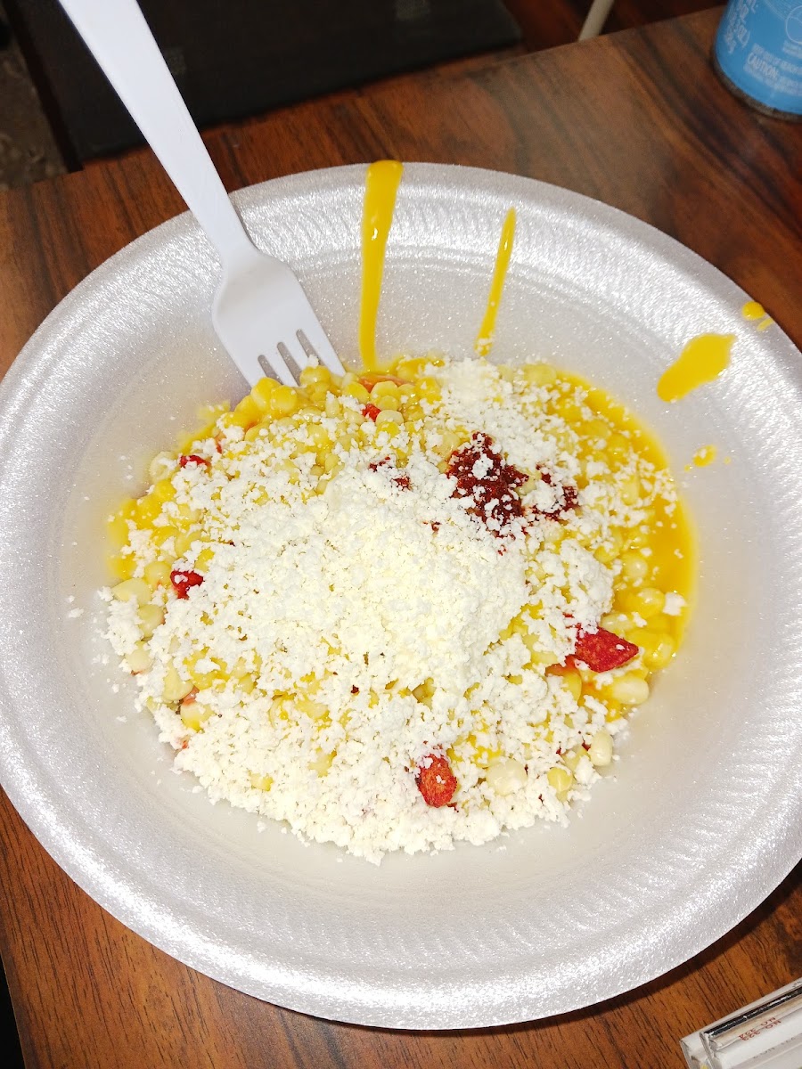 There agua de piña delicious Yellow elote in cup with hotcheetos Nacho cheetos with jalapeños yum .