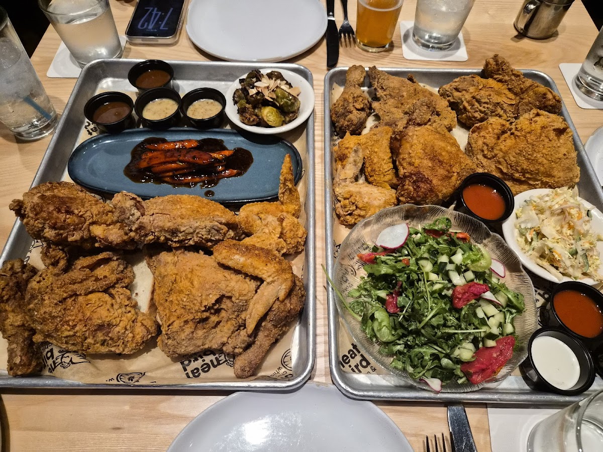 First time visiting after seeing TikTok’s about this restaurant. Overall good experience, the restaurant aesthetic was super cute. We enjoyed the Scott & Ramona cocktail (very strong and sweet ). I ordered the 3pc Dark and added 2 sides. This is an a la carte menu style but the prices were reasonable! Be aware that wait times for food may be long, you’re able to seat yourself which was fine but I do think the waitresses need to be more cognizant of when customers sit and how long it takes for them to be greeted. In addition to how long it takes for the meals to come out and food being hot.