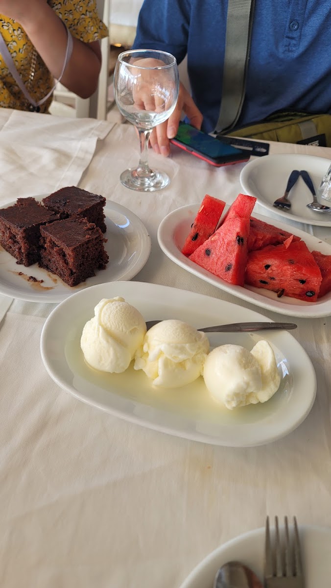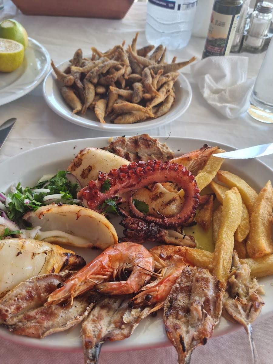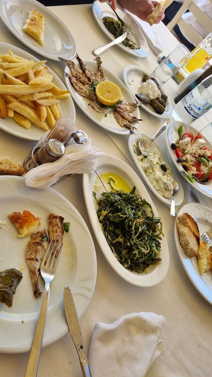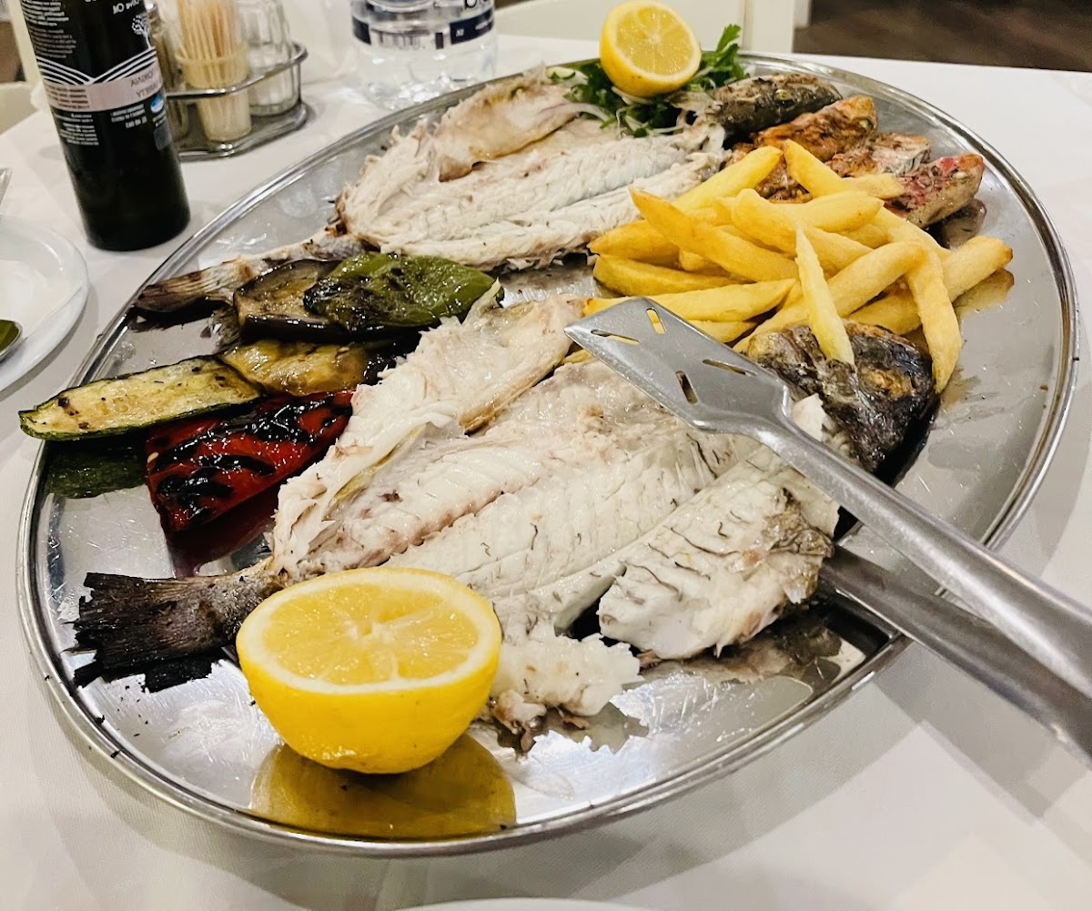 Very generous portions and even more generous service. We had the Greek salad, garlic salad dip and bread followed by the fish platter for two. We barely managed to finish everything but luckily there were helpful harbour cats around who were happy to assist us in finishing up the bits of fish that we couldn't eat. They were waiting politely next to our table though until we dropped some food for them, they don't jump up and try to steal the food or anything like that. The service was great too because after our meal they actually brought us not one but three desserts and a ca. 150ml bottle of raki on the house! Would definitely recommend!
