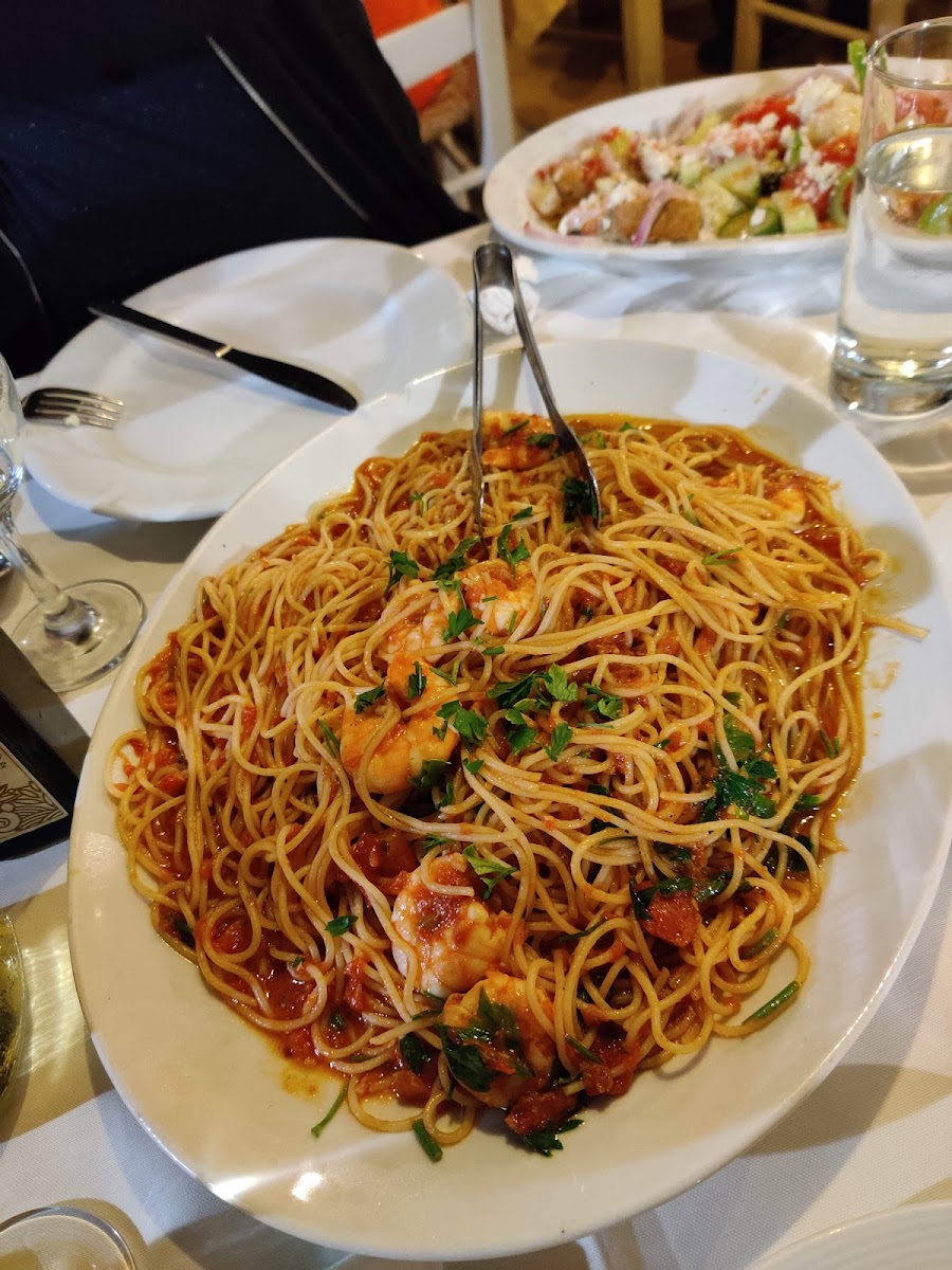 Village salad, Fresh kalamari, Mediterranean pasta, kritharoto with shrimp were just delicious! Large portions and very friendly staff! Halvas and choc cake with ice cream were complimentary and very delicious!!!