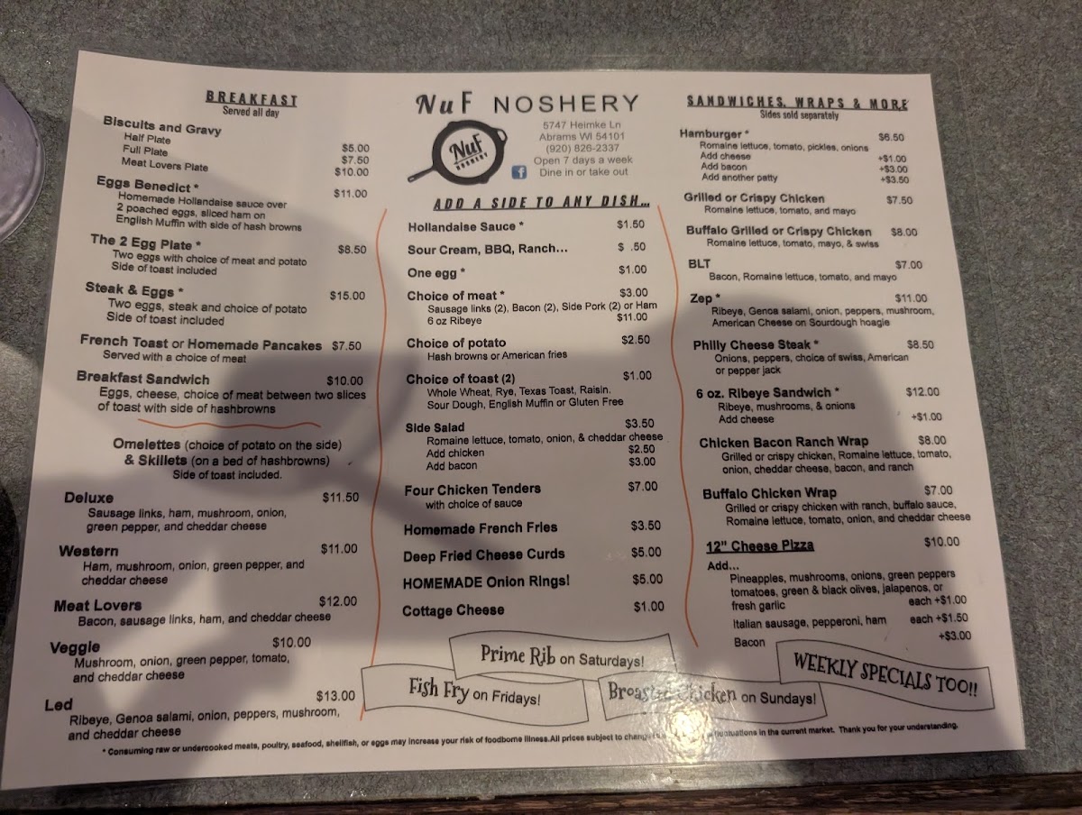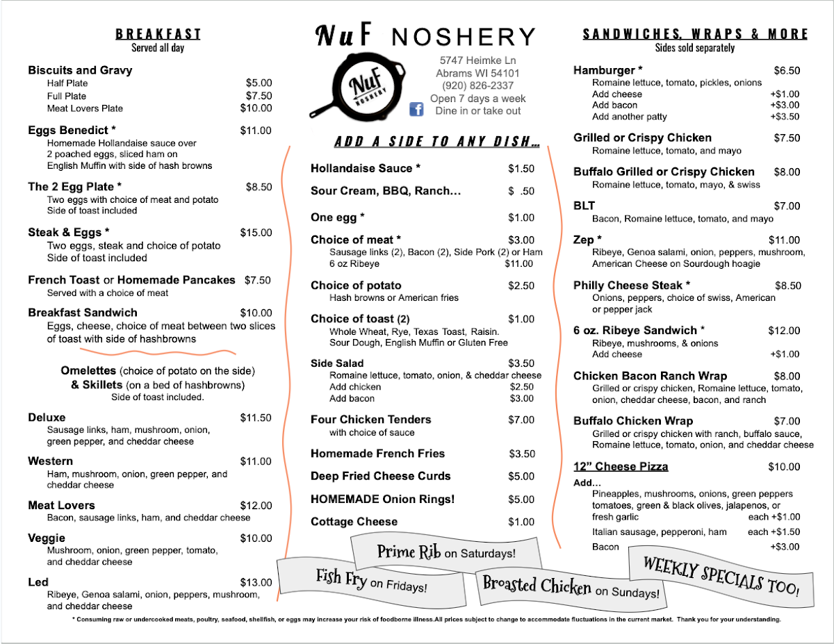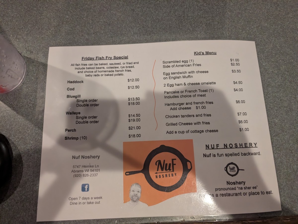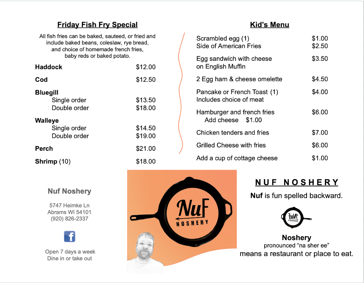 All fish fries can be baked, sauteed, or fried and include baked beans, coleslaw, rye bread, and choice of homemade french fries, baby reds or baked potato.