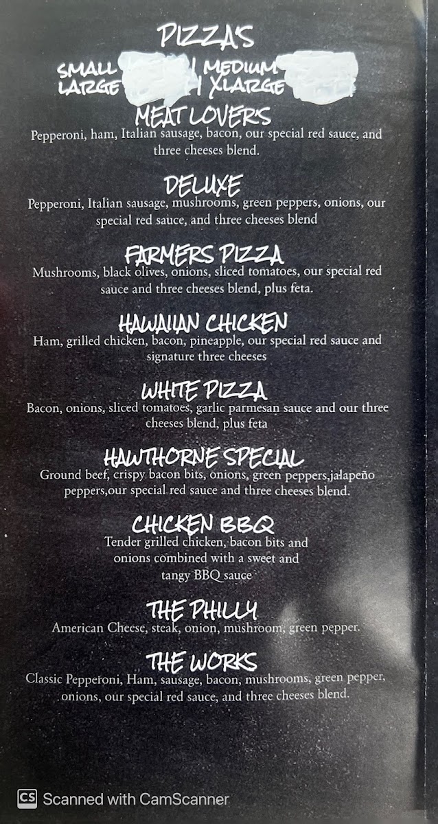 Original, pizza cheese, pizza sauce, ham, pineapple, grilled chicken and bacon.